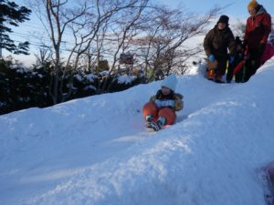 雪遊びのコーナーでは、例年恒例となった滑り台も大人気。