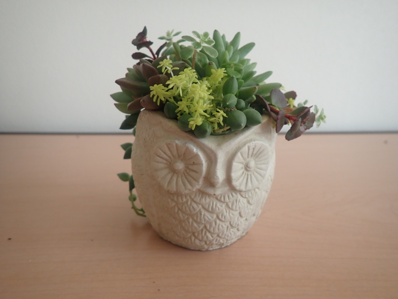 かわいいフクロウの鉢にいろいろな種類の多肉植物を自分の好みに
