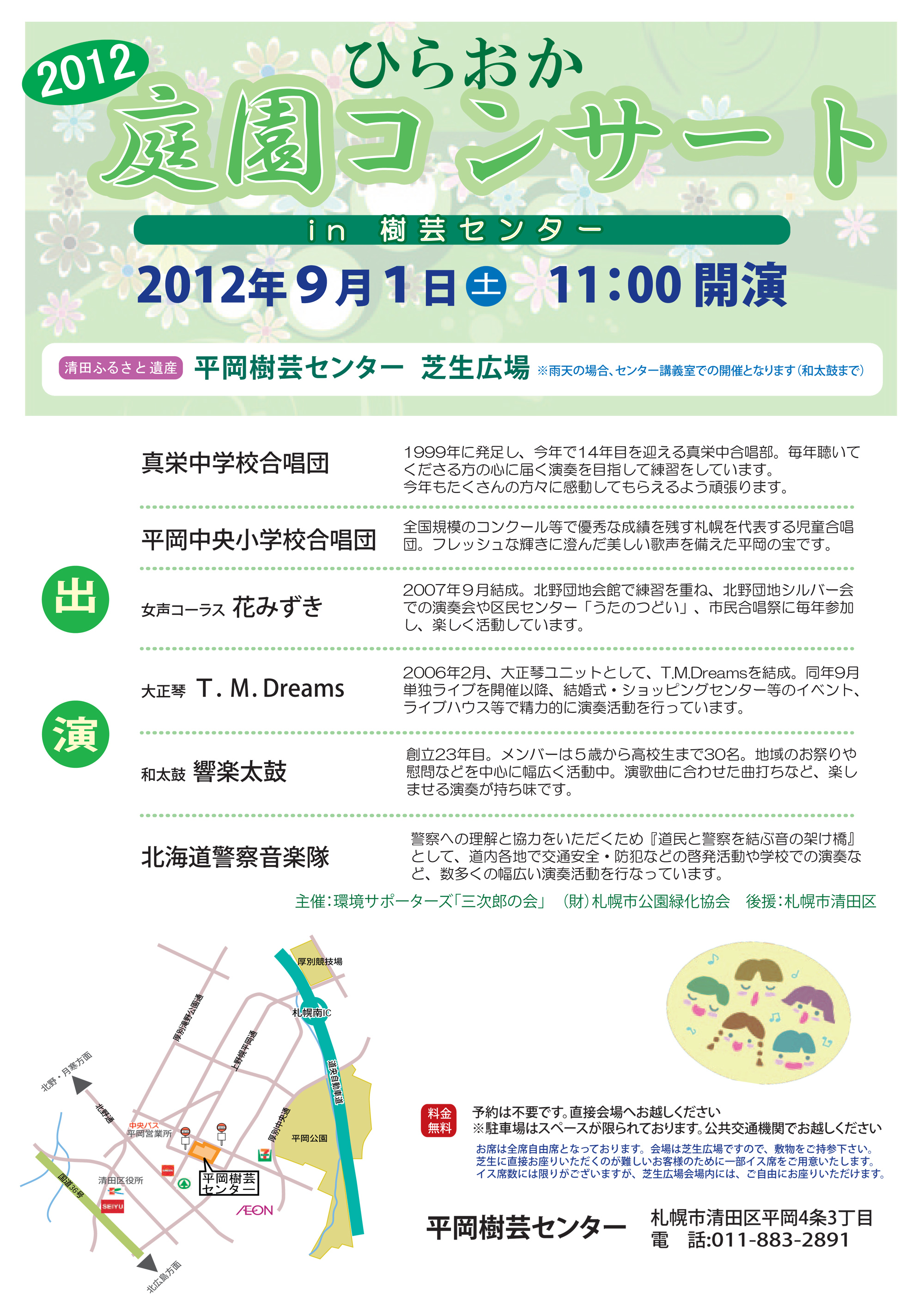 今年も、9月1日(土)に平岡樹芸センターにおいてコンサートを開催いたします。開園は午前11時となっておりますので、たくさんの方のご来園をお待ちしております。また、駐車スペースが少ないので、公共交通機関でのお越しをお願いいたします。