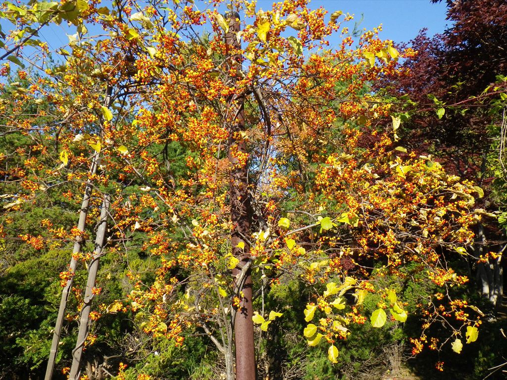 ツルウメモドキは熟し、黄葉を遂げた葉はほぼ散ってしまいました。