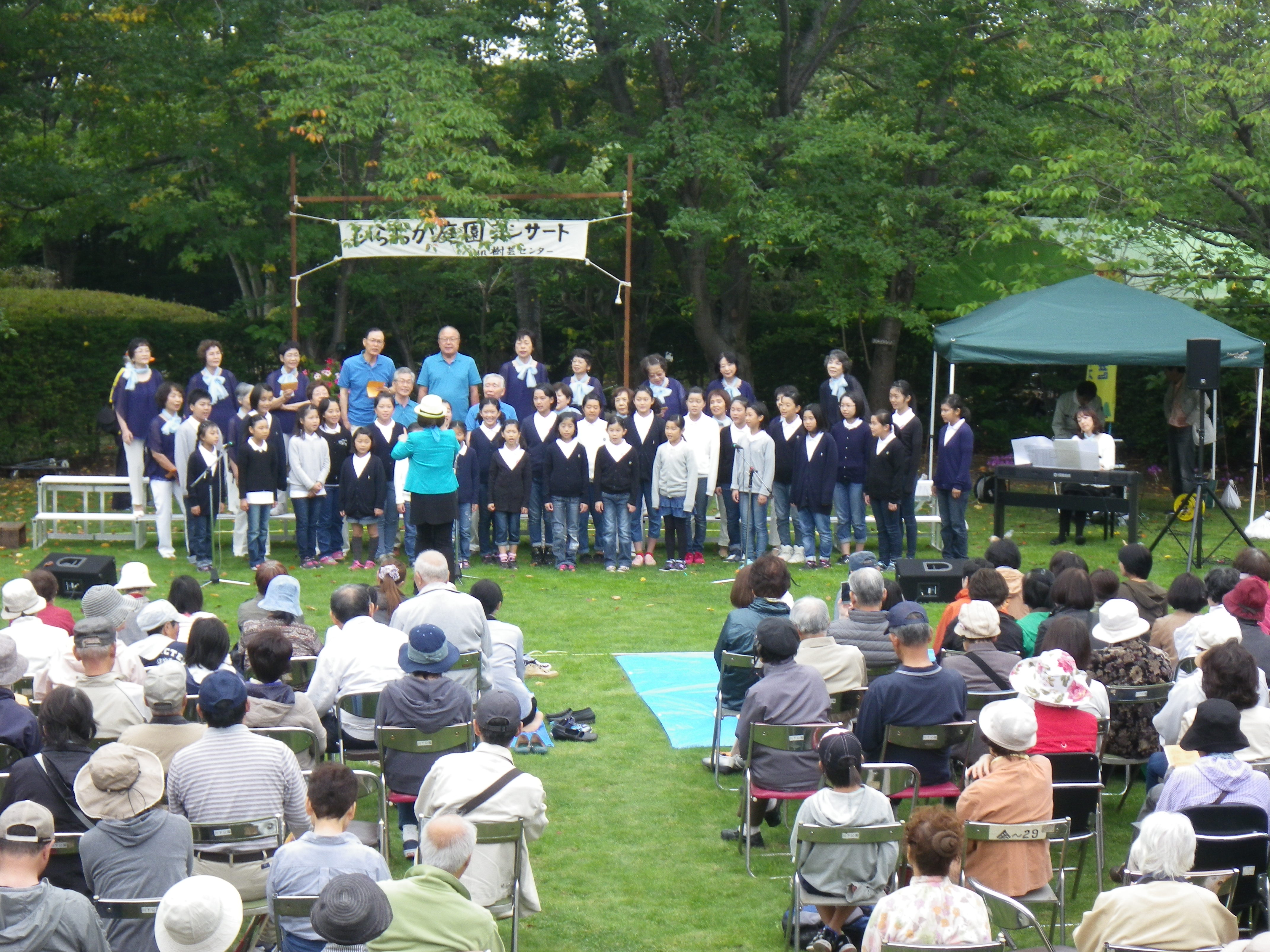 平岡中央小学校の生徒たちの澄んだ声が庭園に響き渡る。