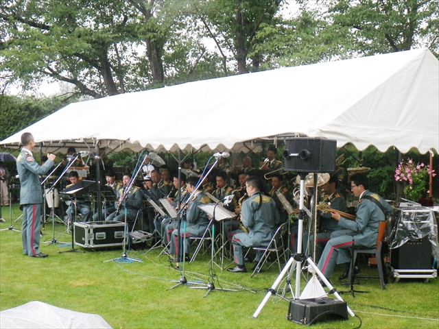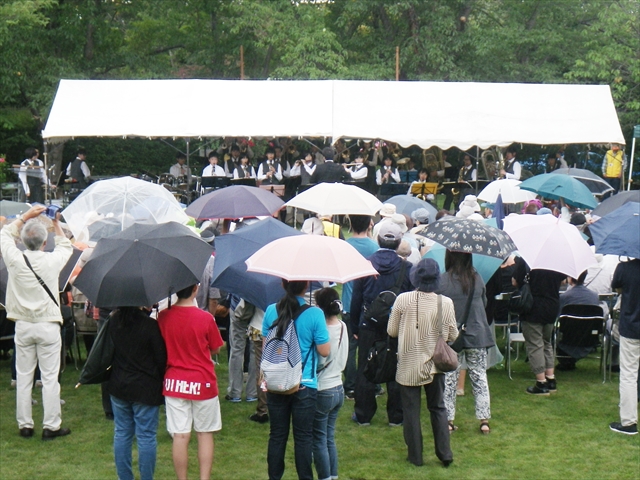 指揮の山下隊長は雨男と司会からご紹介があり、その力のせいか(?)本降りの雨となってしまいましたが、笑顔で演奏を披露してくださり、観客から「ブラボー!」の歓声も。曲目も小さいお子さんから、お年寄りまでみなさま楽しめる曲の数々でした。大変すばらしい演奏をありがとうございました!