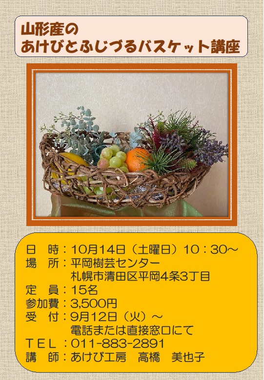 10月14日に「山形産のあけびとふじつるのバスケット」を開催いたします。