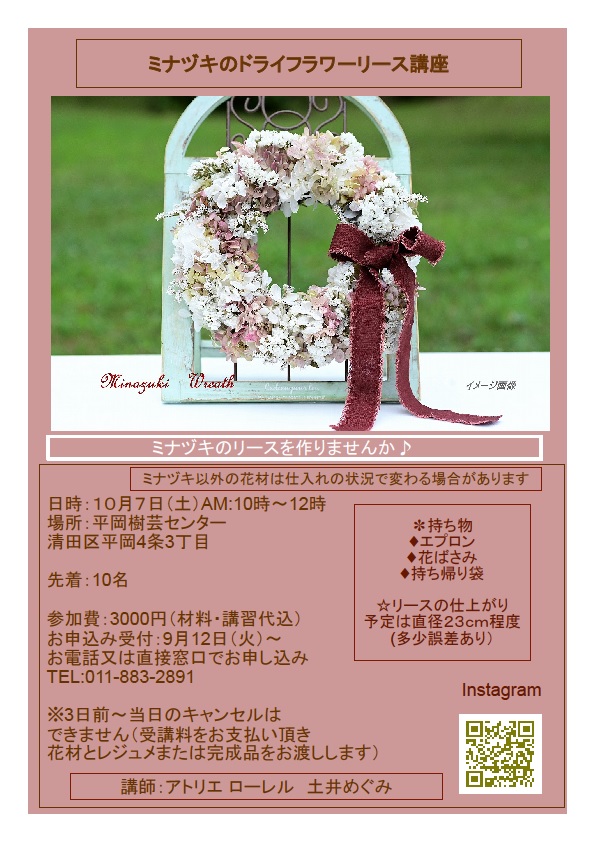10月7日に「ミナヅキのドライフラワーリース講座」を