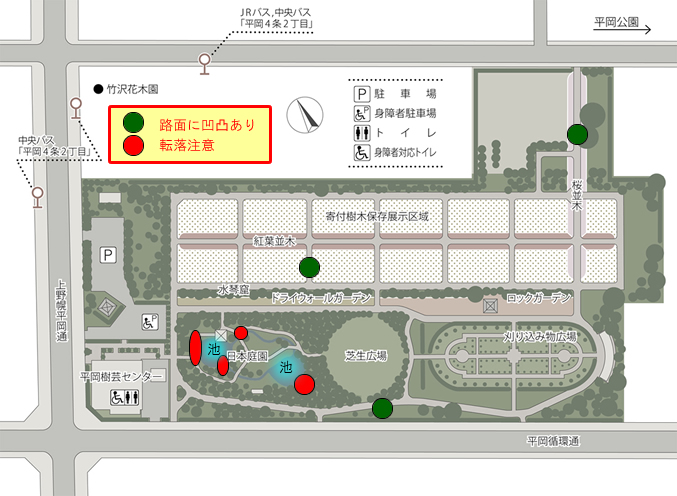 ・みなさんの公園です。大切に利用しましょう。 ・ゴミの減量、持ち帰りにご協力ください。 ・園内での植物採取はできません。 ・当公園は、ペットの入園はできません。 ・自転車の入園はできません。駐輪場をご利用ください。 ・スケートボード、キックボードの入園はできません。 ・園内の注意看板や職員の指示に従ってください。 ・公園内では、花火を含め火気の使用はできません。 特に夜間の花火は近隣住民のご迷惑になりますのでご遠慮ください。 ・平岡樹芸センター「みどりーむ」は、AED設置施設です。 事務室に設置しています。 ・ハザードマップはこちら