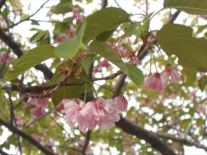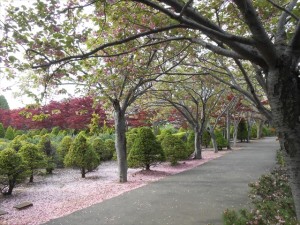 八重桜のトンネルは早くも散り始め、ピンクの絨毯になっています。