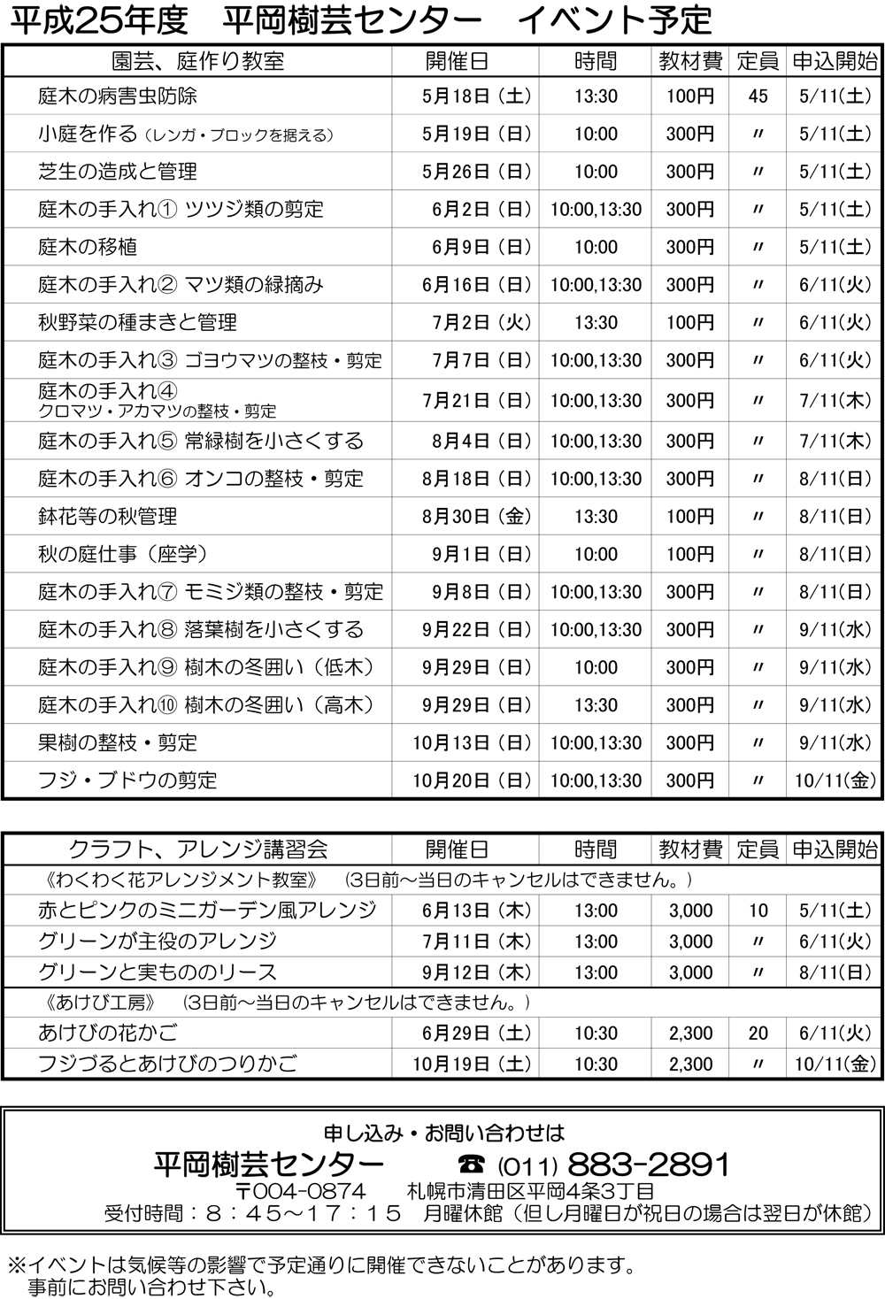 今年も平岡樹芸センターで様々な講習を開催します。