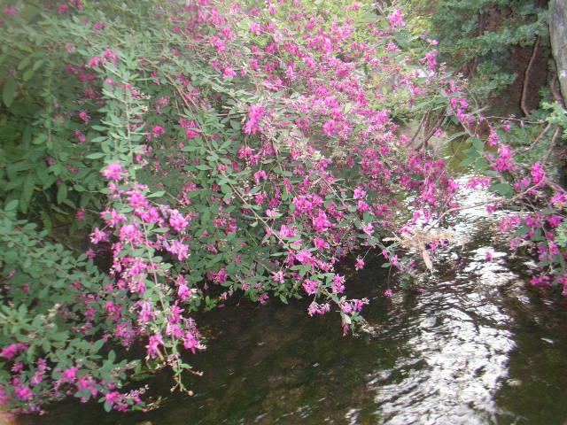 平岡樹芸センターでは満開のハギが水面に垂れ、ミナヅキは白からピンクに変わってきました。