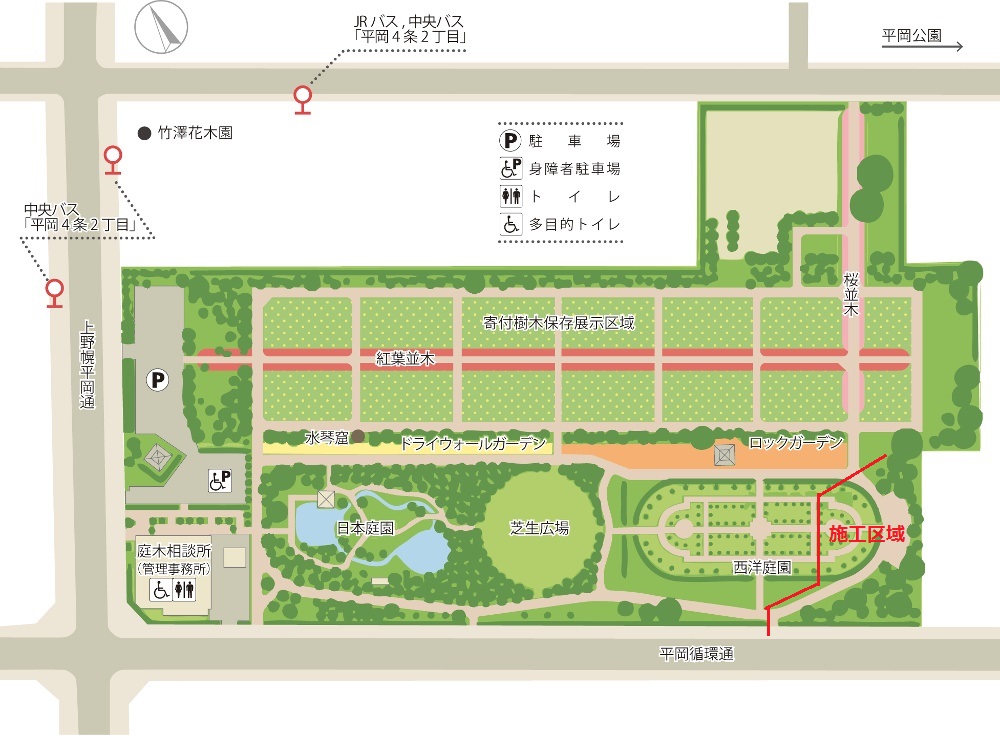 ・みなさんの公園です。大切に利用しましょう。 ・ゴミの減量、持ち帰りにご協力ください。 ・園内での植物採取はできません。 ・当公園は、ペットの入園はできません。 ・自転車の入園はできません。駐輪場をご利用ください。 ・スケートボード、キックボードの入園はできません。 ・園内の注意看板や職員の指示に従ってください。 ・公園内では、花火を含め火気の使用はできません。 特に夜間の花火は近隣住民のご迷惑になりますのでご遠慮ください。 ・平岡樹芸センター「みどりーむ」は、AED設置施設です。 事務室に設置しています。 ・ハザードマップはこちら