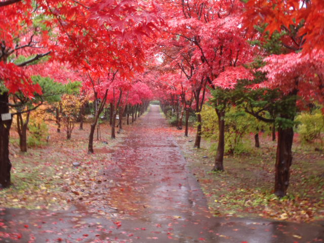昨日から止まずに降り続ける雨がノムラモミジの並木道を赤く映えさせます。
