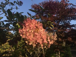 並木道の通り沿いに咲いているミナヅキはだいぶ紅葉が進んでいます。