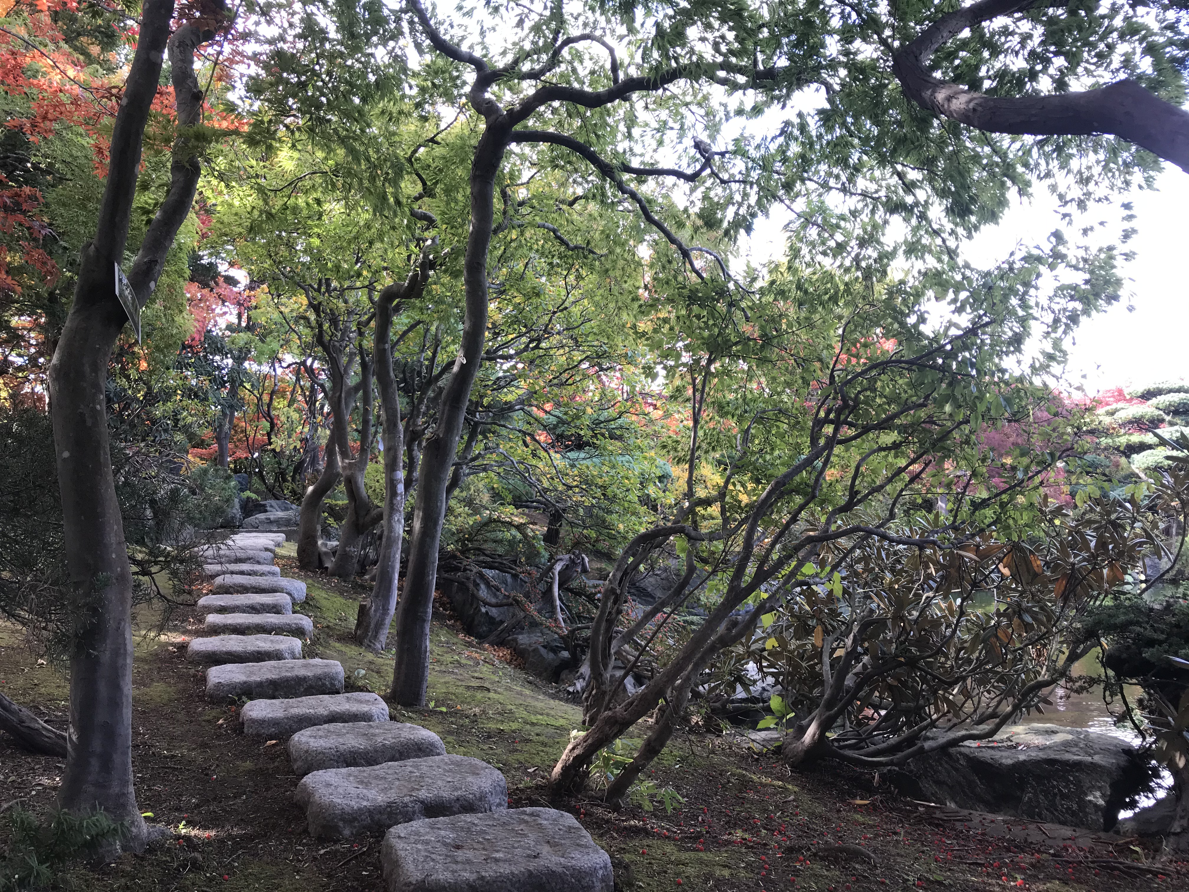 芝生広場と日本庭園の中間、ふと脇に目をやると、飛び石を配した小路があります。
