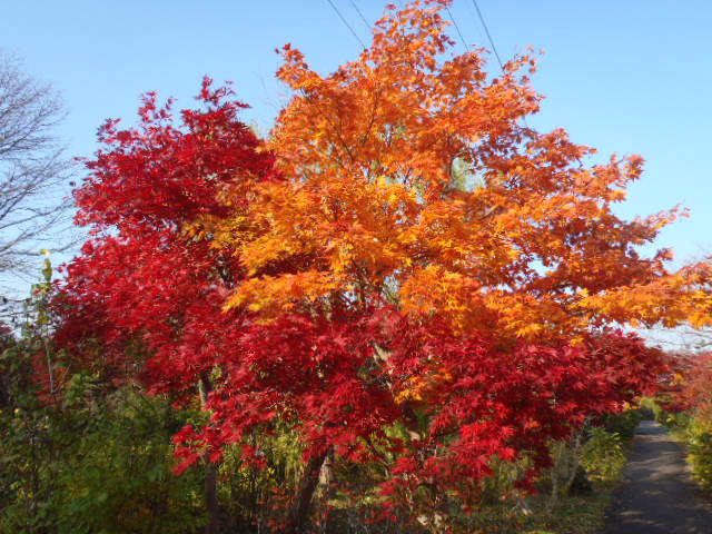 太陽に照らされた紅葉は鮮やかで素敵ですね。