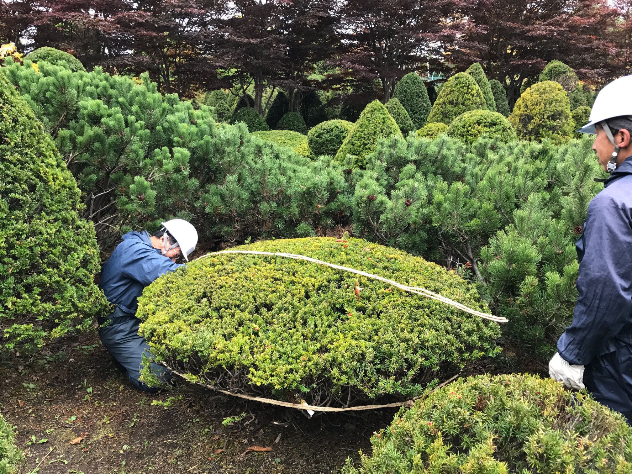 ご覧のとおり円盤状に仕立てられたキャラボクは横幅が広く、胴回りを絞るのが大変です。当園では2名で協力して作業を進めます。縄が緩まないよう、ずれないように、十字に筋交いを渡し補強します。