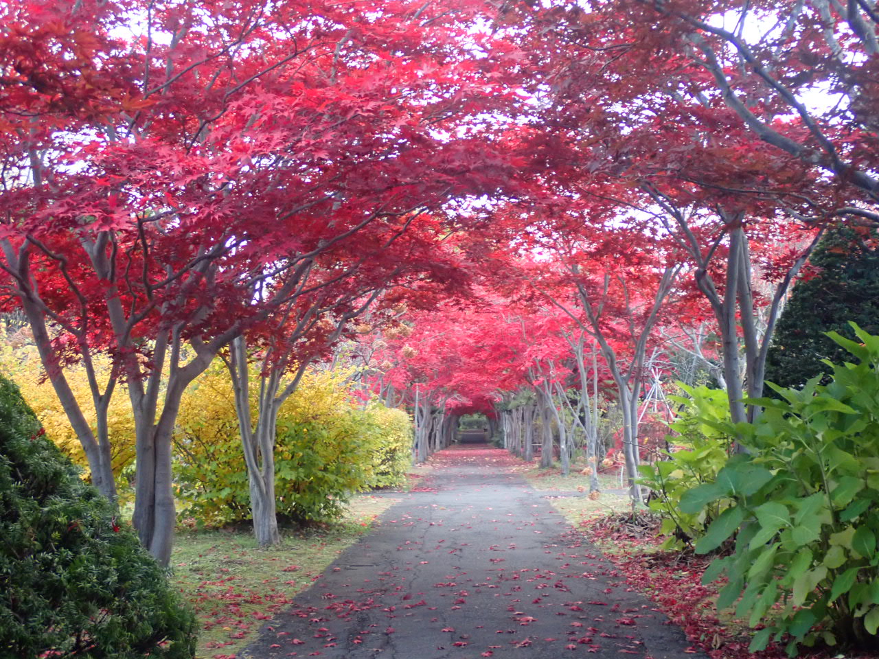 ノムラモミジのトンネルは、赤く色付き見頃を迎えています。