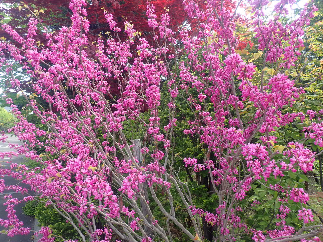 駐車場にハナズオウが咲いています。