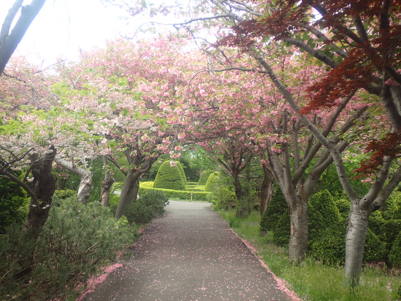 サクラのトンネルは、サクラの花びらが園路に落ちています。