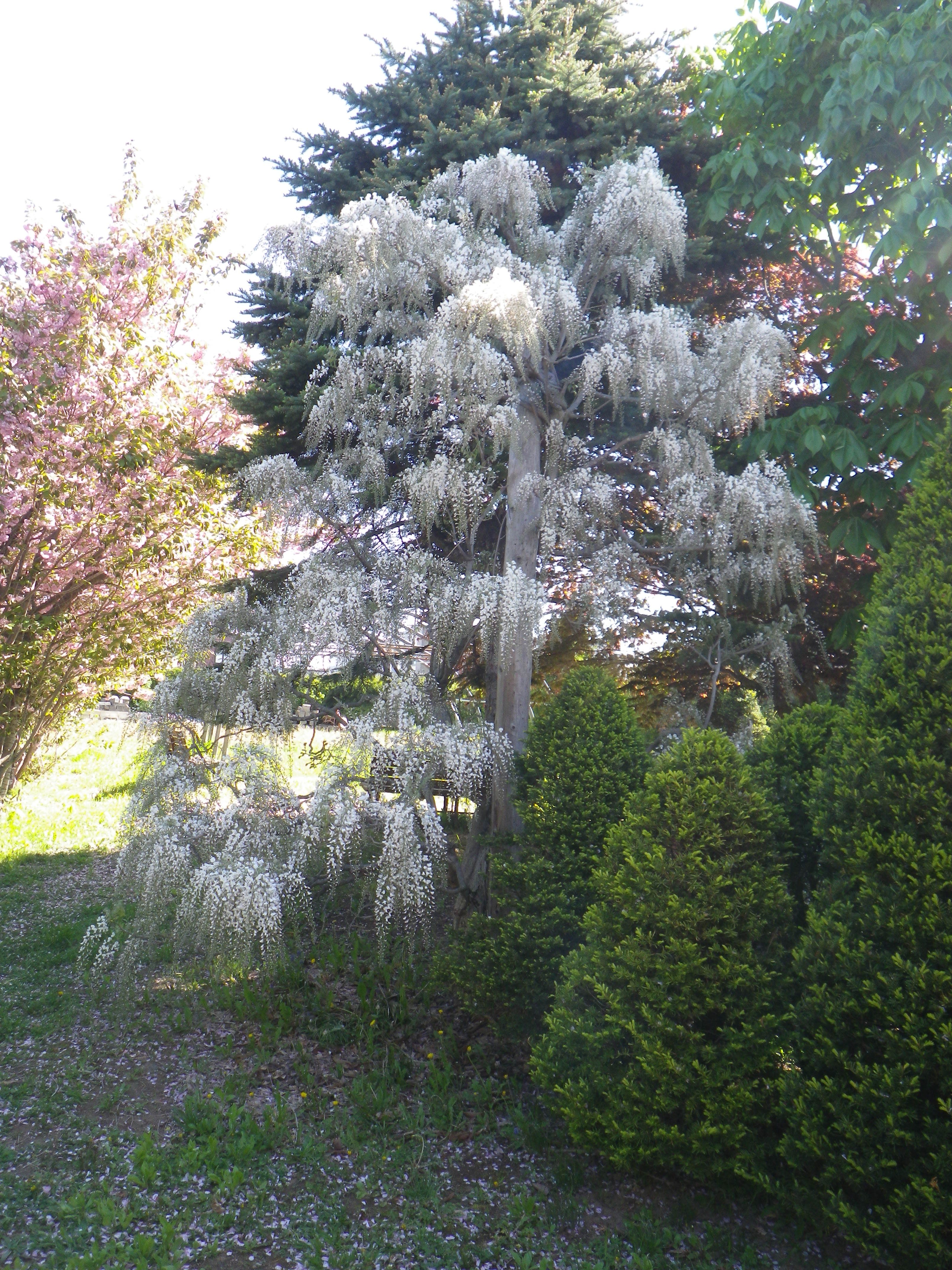 シロフジが見頃を迎えました。流れる滝のように花が咲いており、非常に見ごたえがあります。