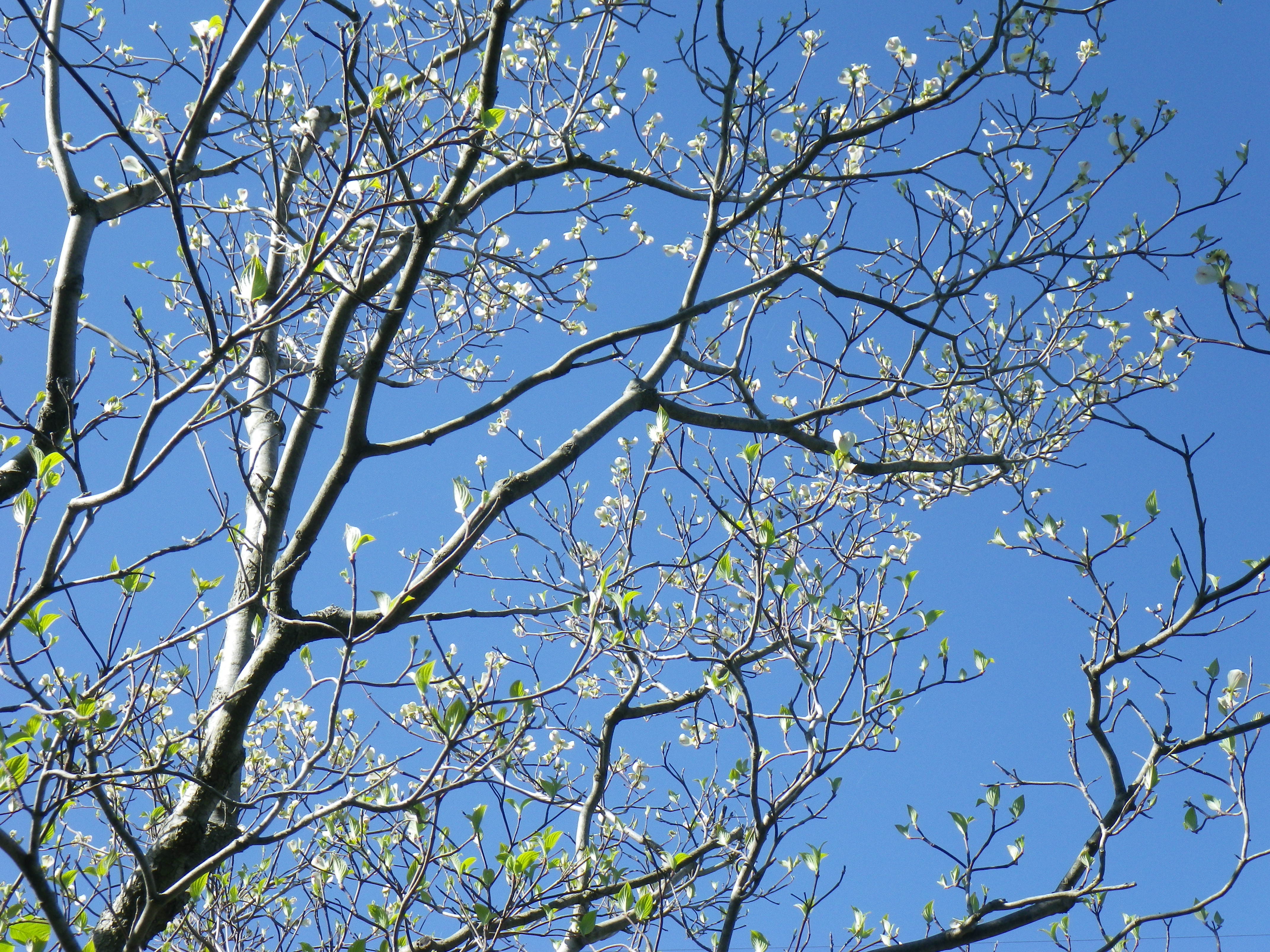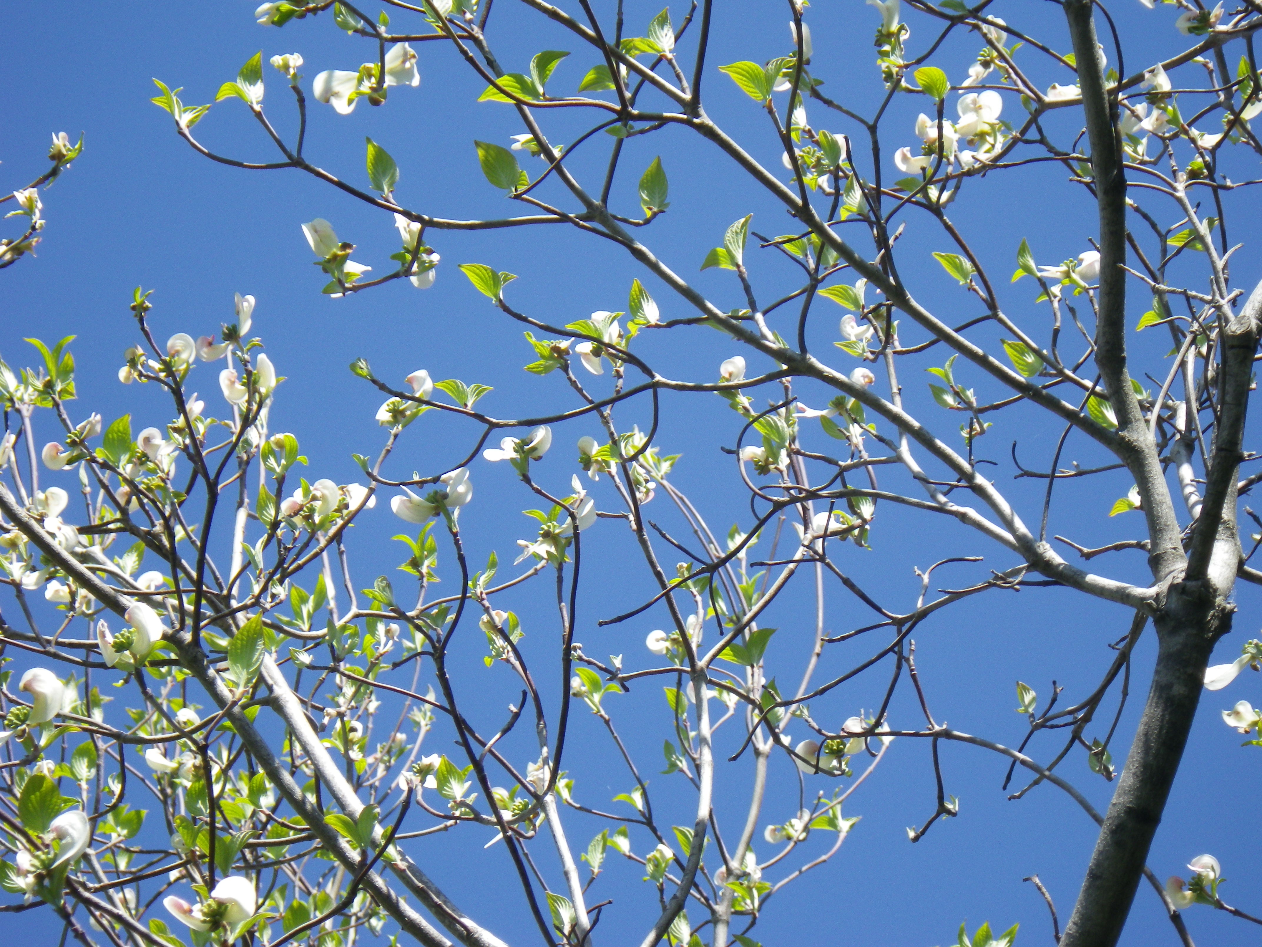 ハナミズキの花が咲きました。今年は例年になくたくさんの花を咲かせています。白く繊細な花と葉の緑色が園内を彩ります。