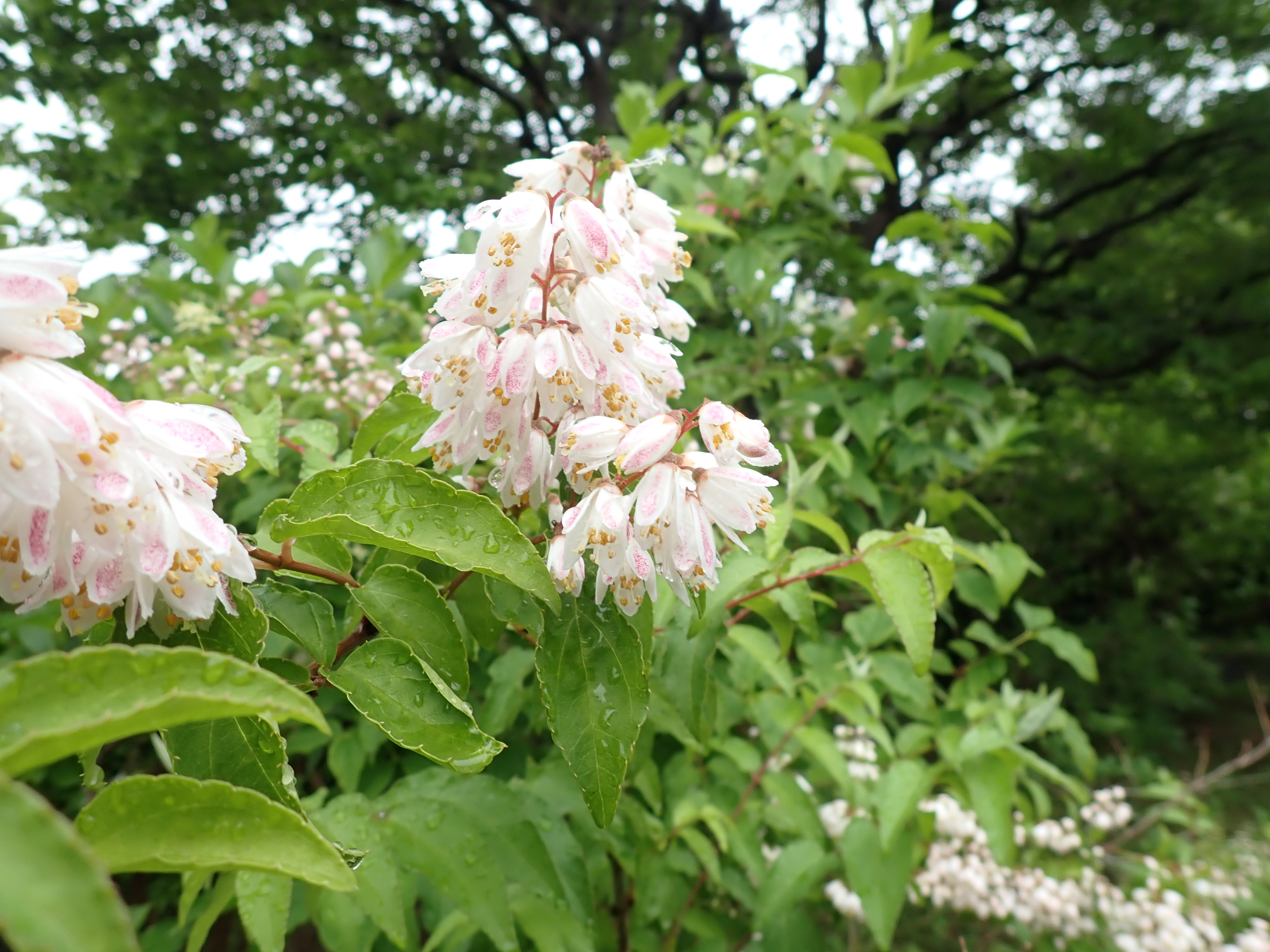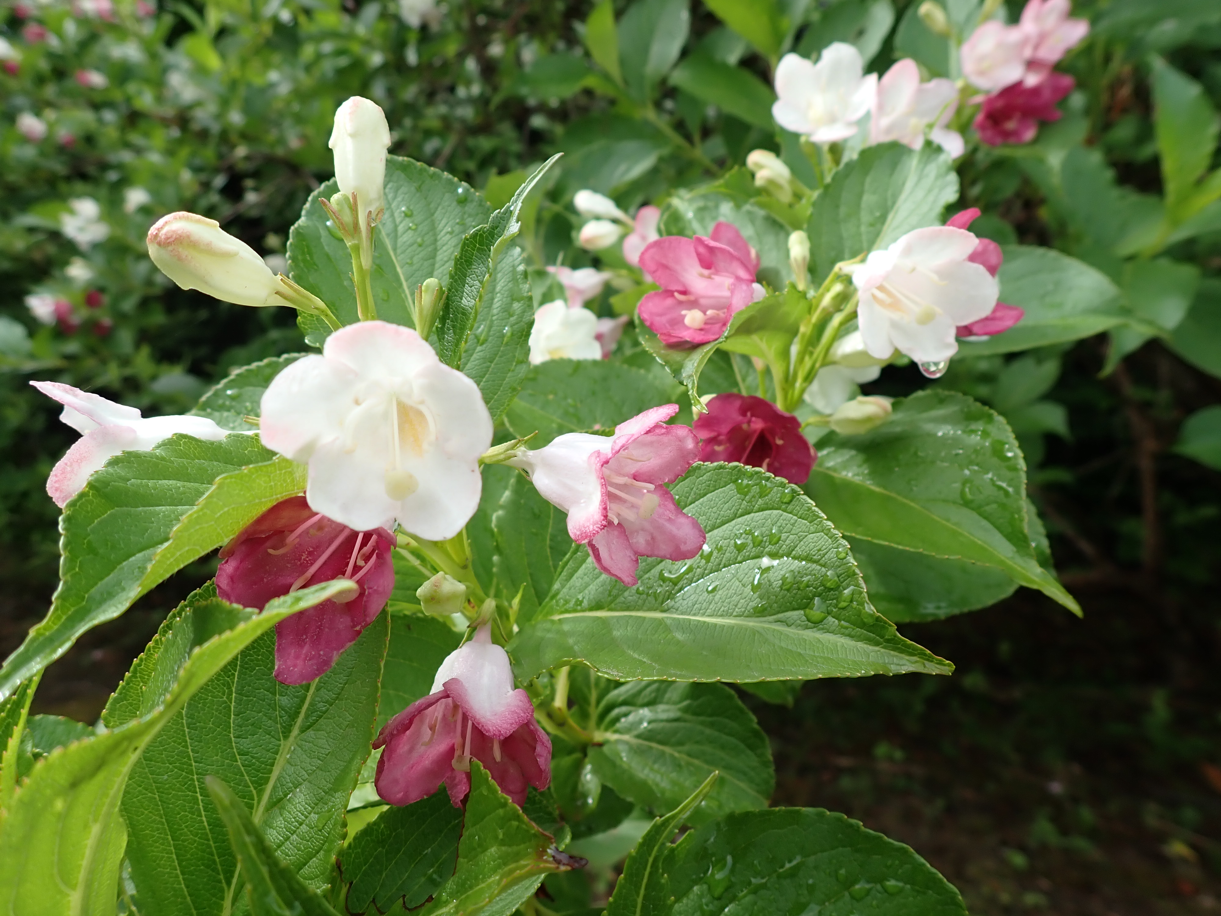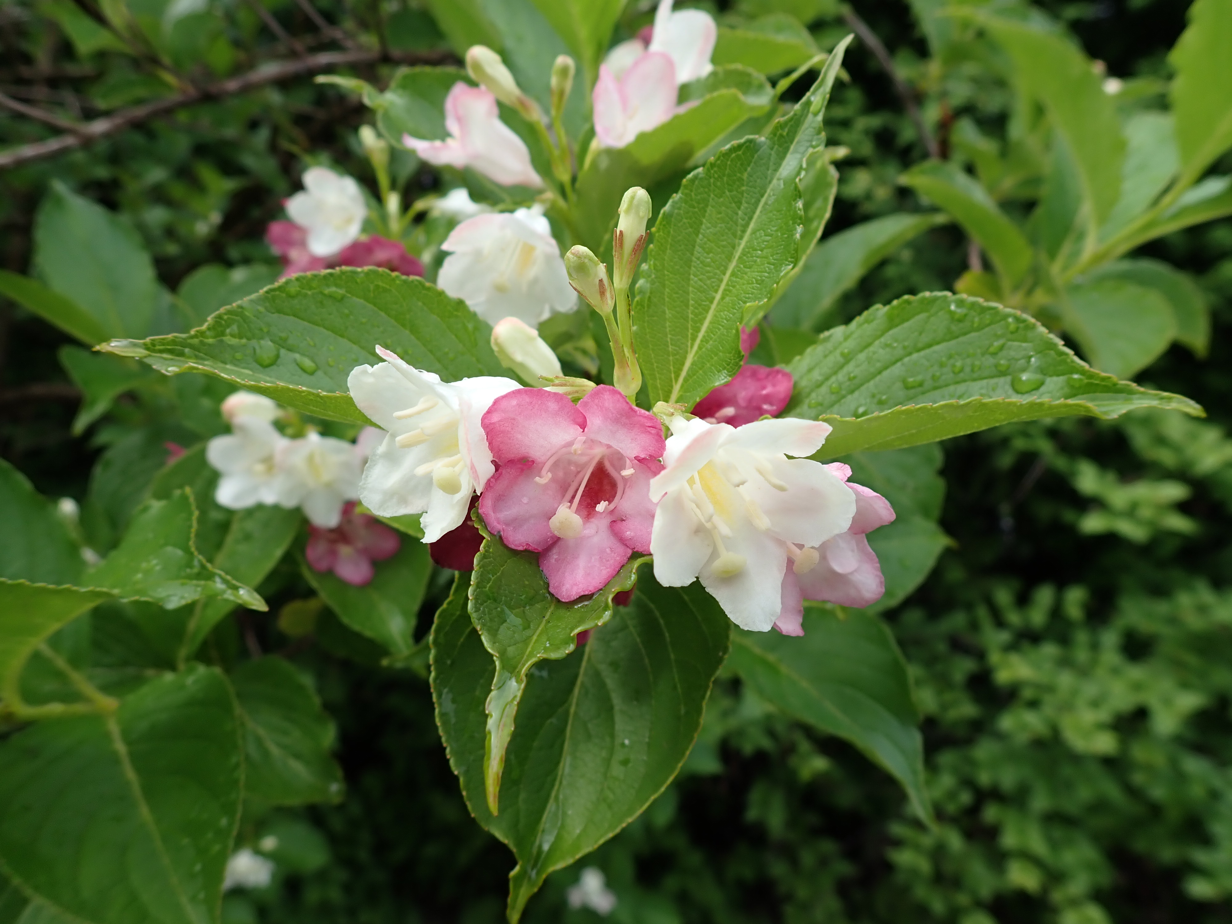 先週は白い花のみだったハコネウツギが赤色に染まっています。