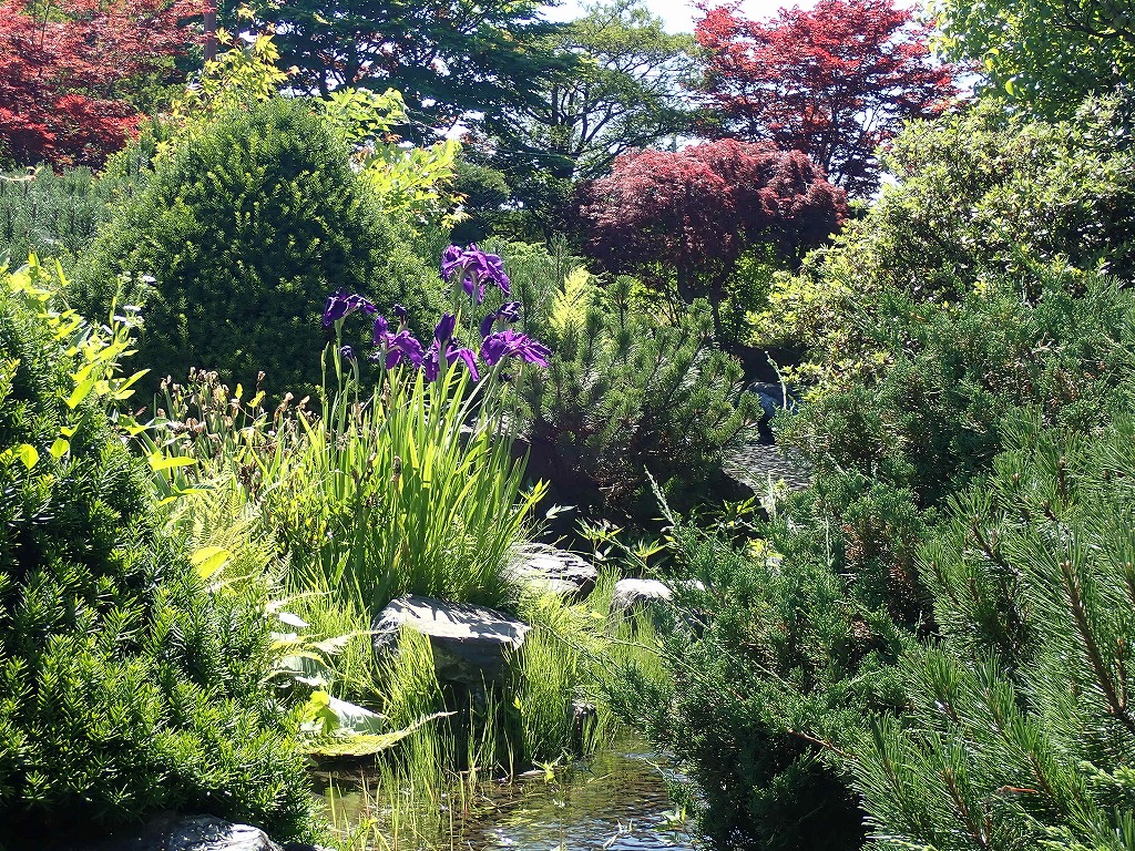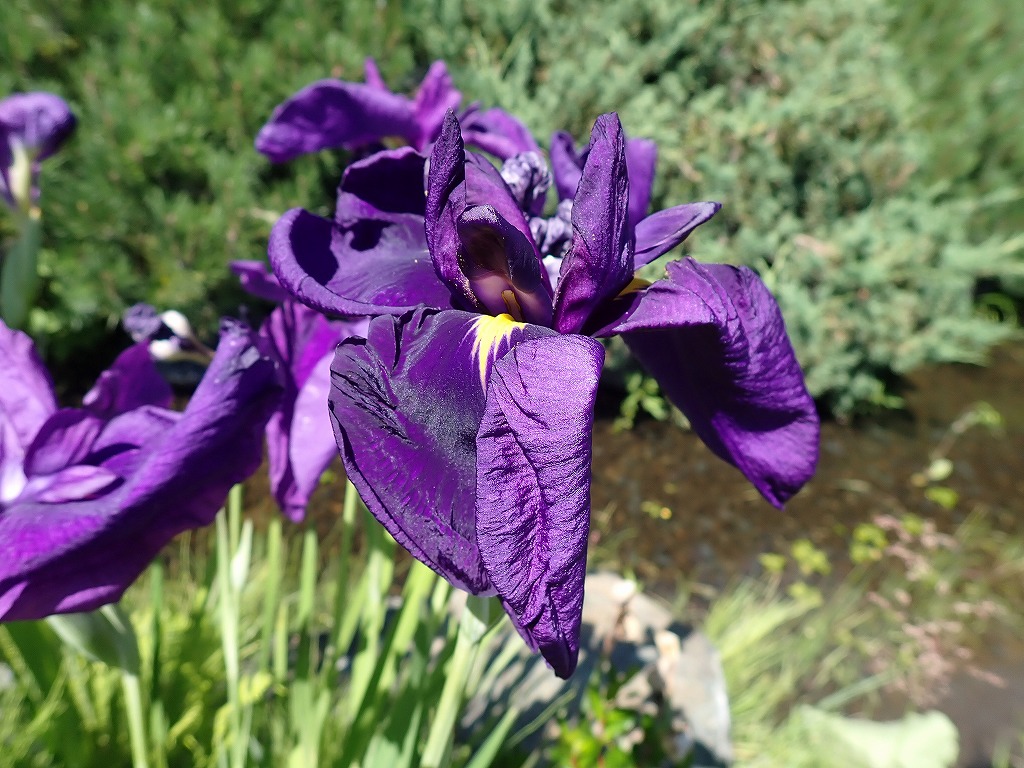 日本庭園の小川の脇にハナショウブが咲いています。