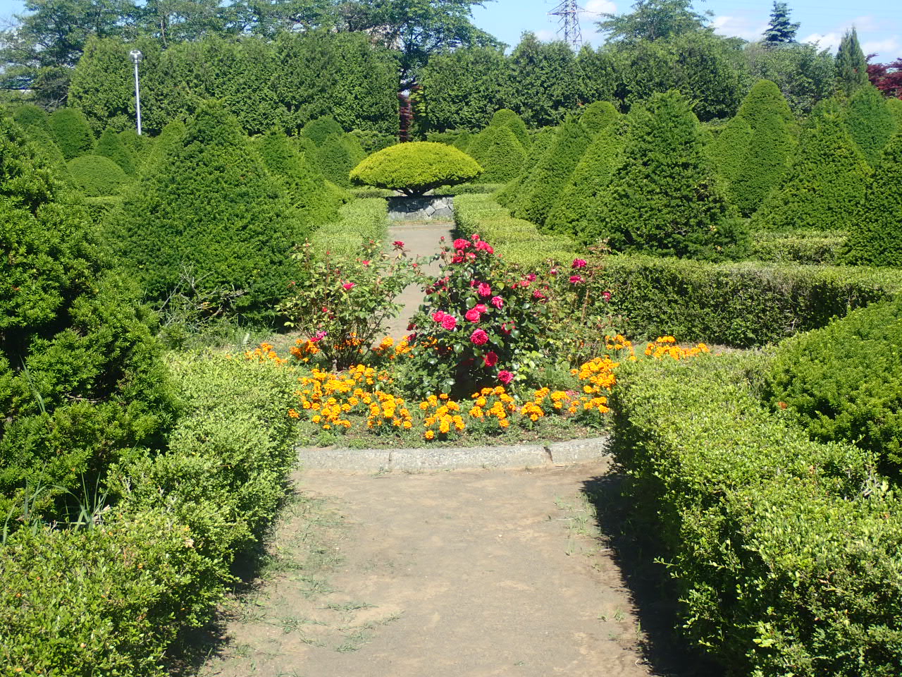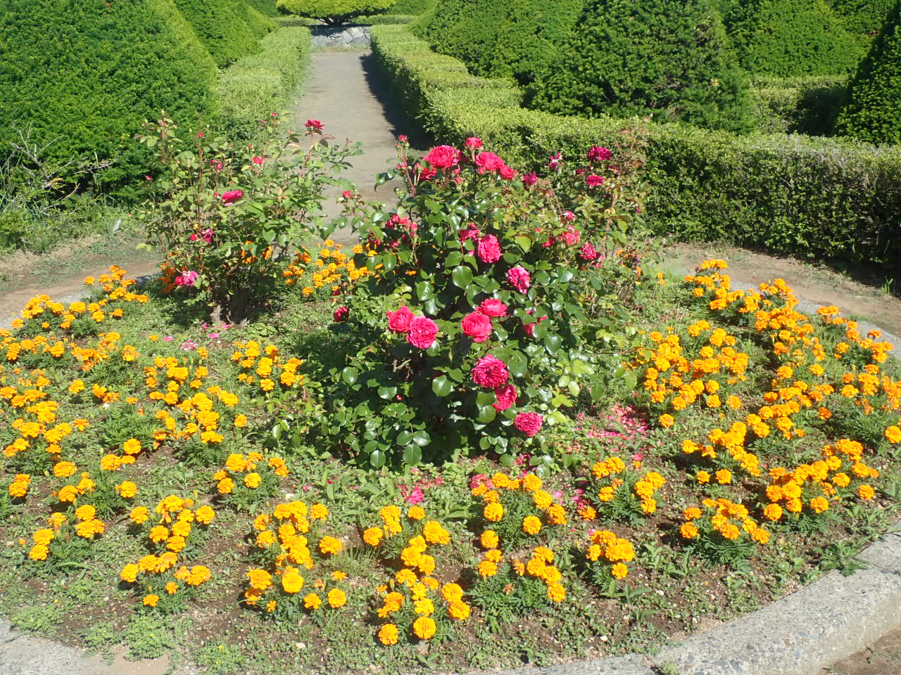 西洋庭園では、マリーゴールドとバラが咲いています。
