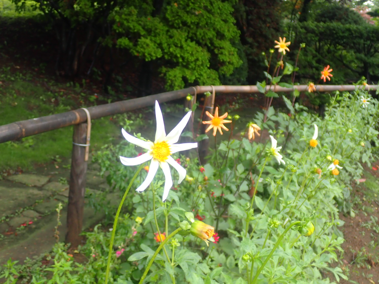 日本庭園の池の周りにダリアが咲いています。