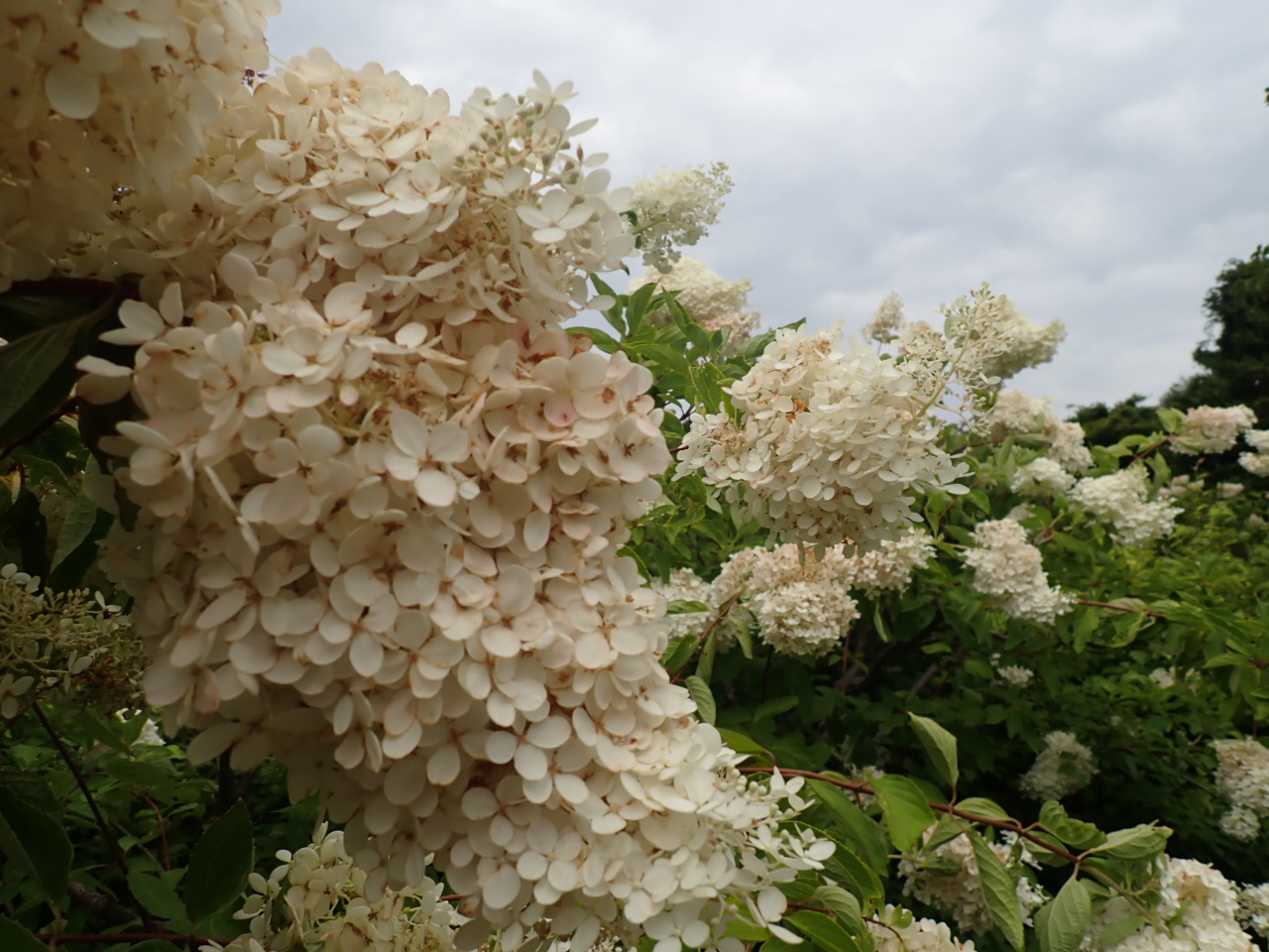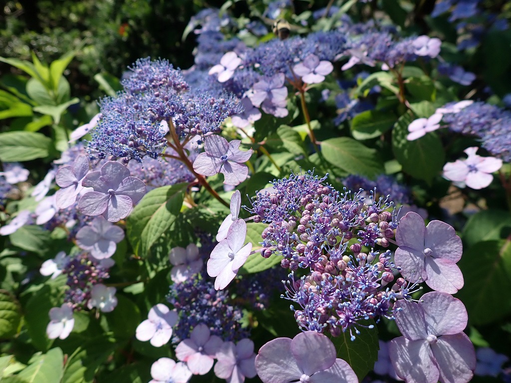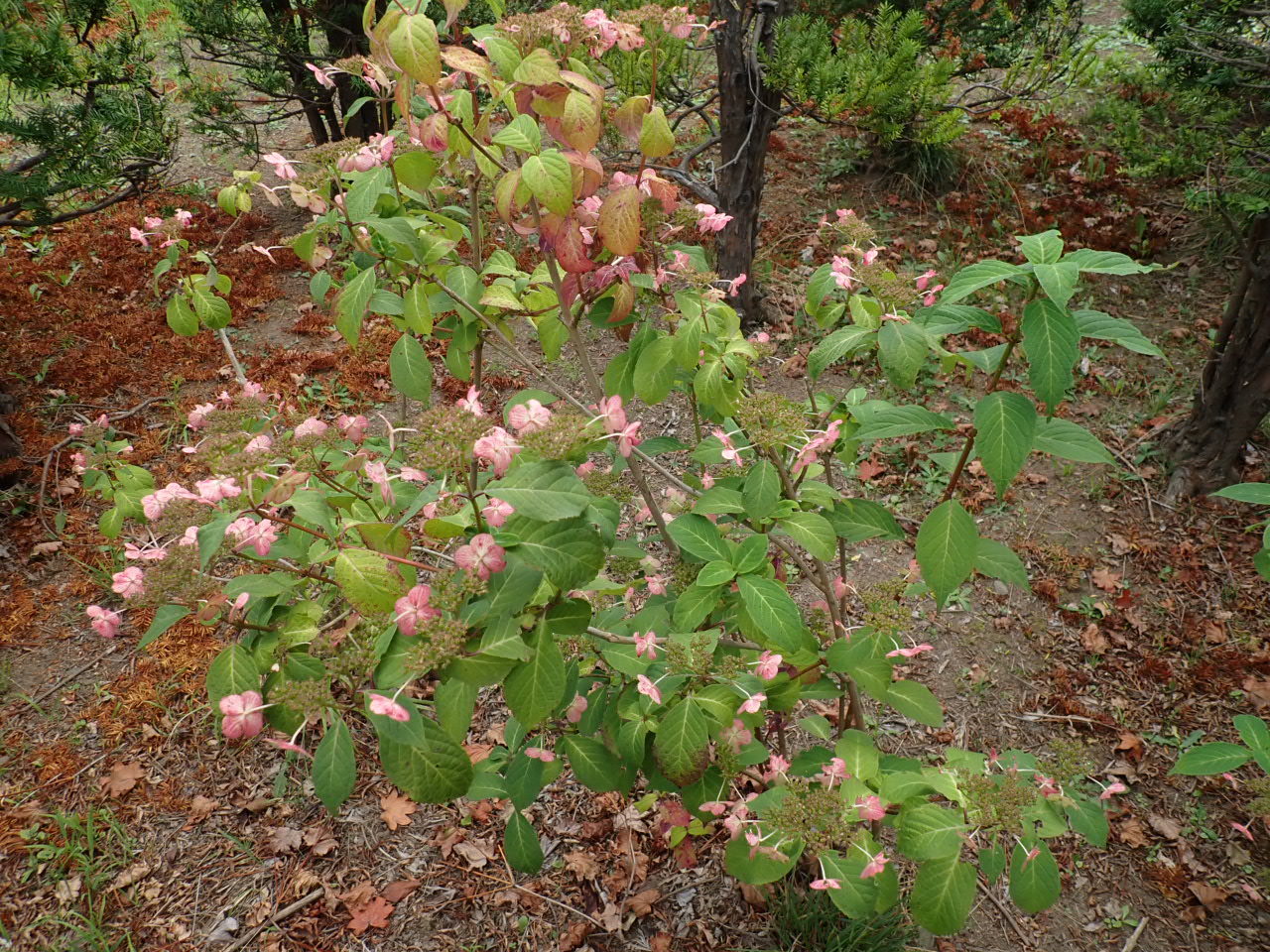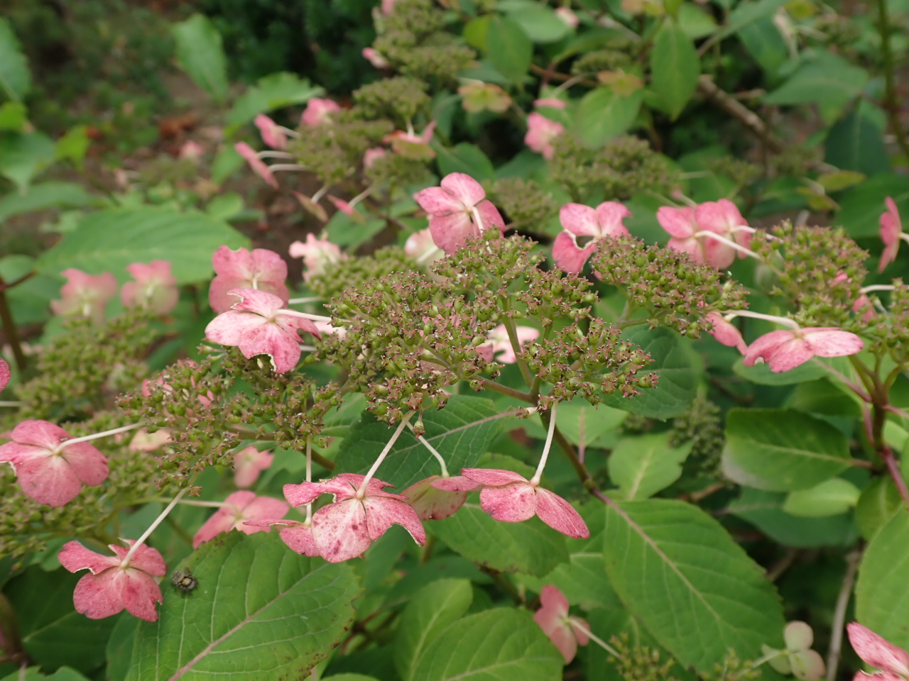 本来の見頃は終わってしまいましたが、青紫色だった装飾花がピンク色に染まり、