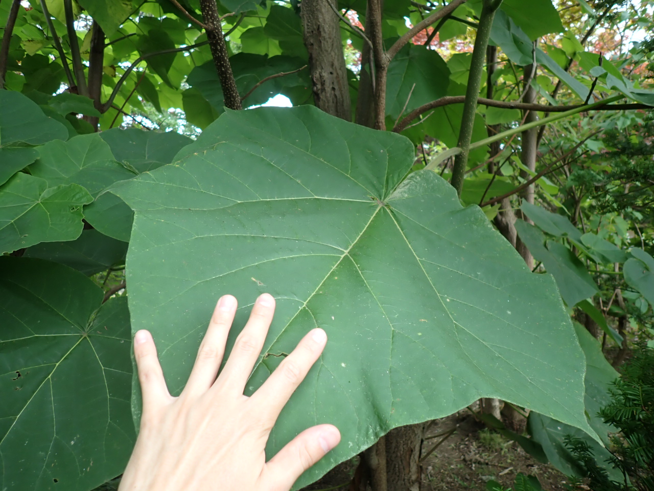 園内の水琴窟付近にある、キリの葉です。