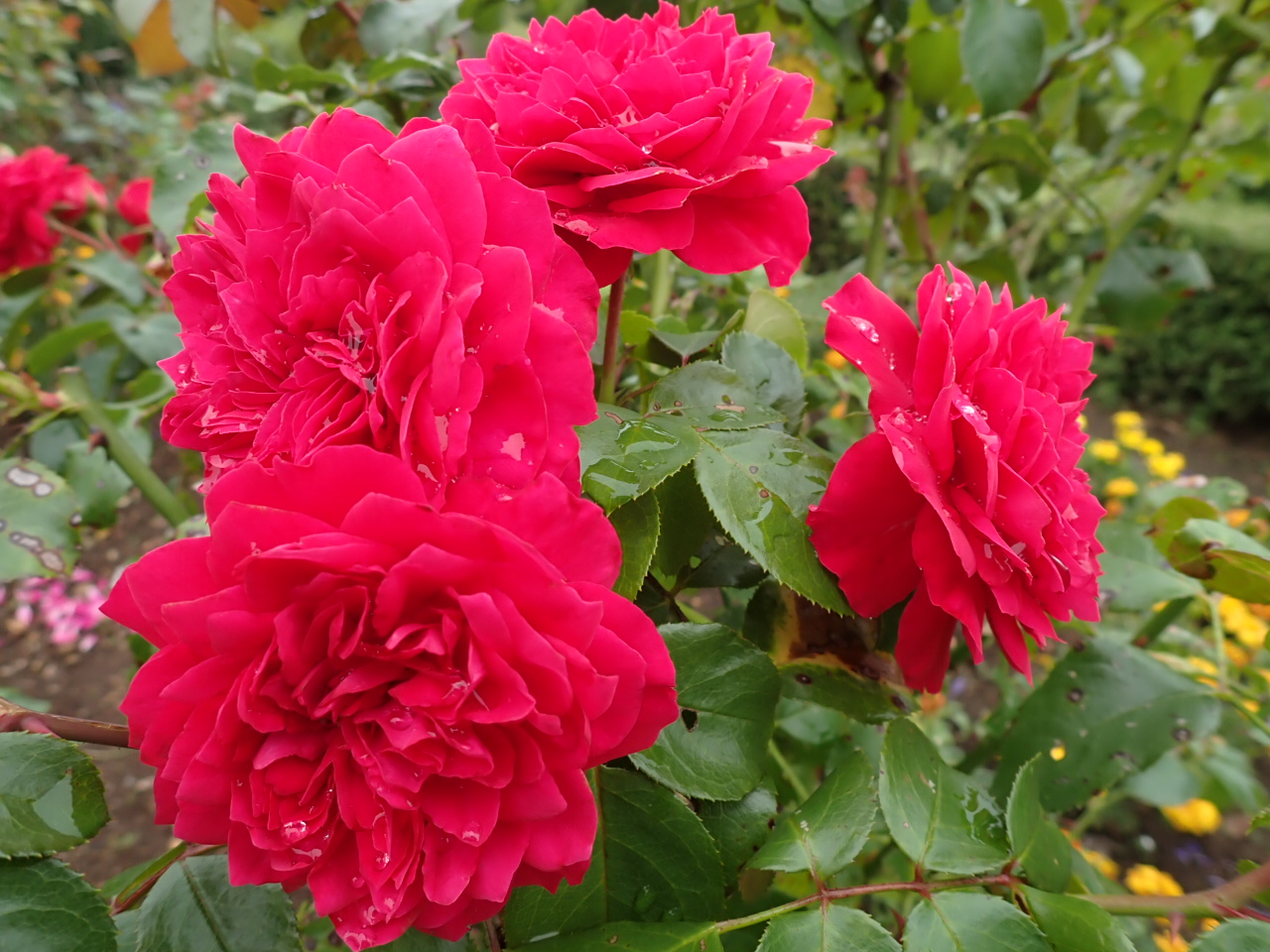 西洋庭園の円形花壇ではバラやタイタンビカスが見られます。