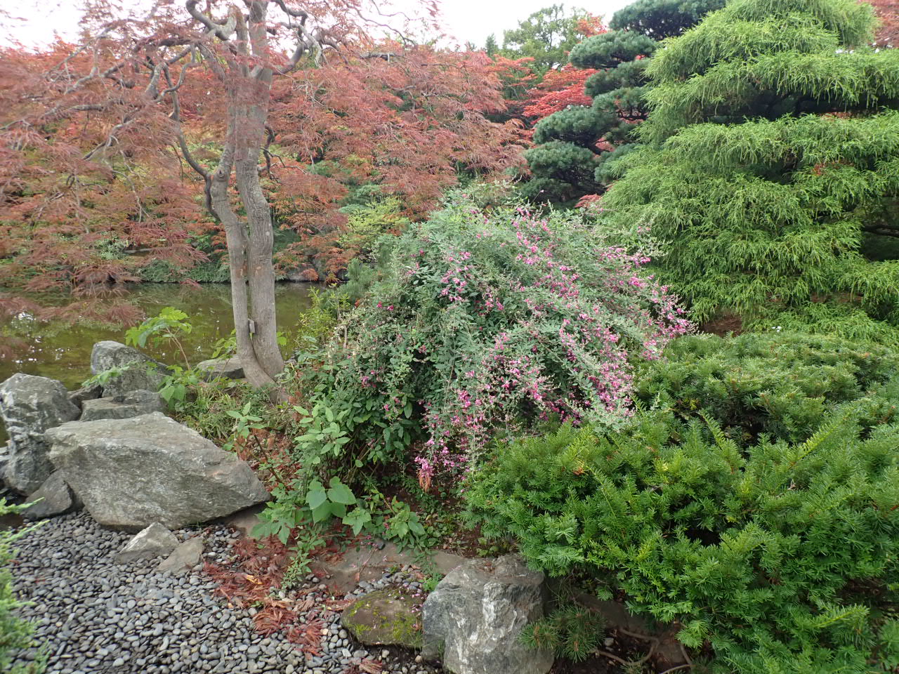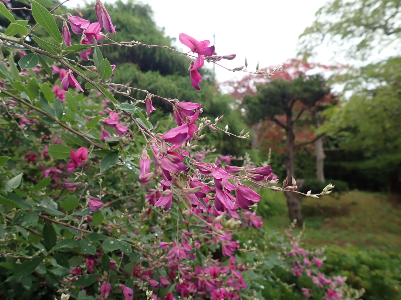 日本庭園の水路脇で、ミヤギノハギが開花しています。