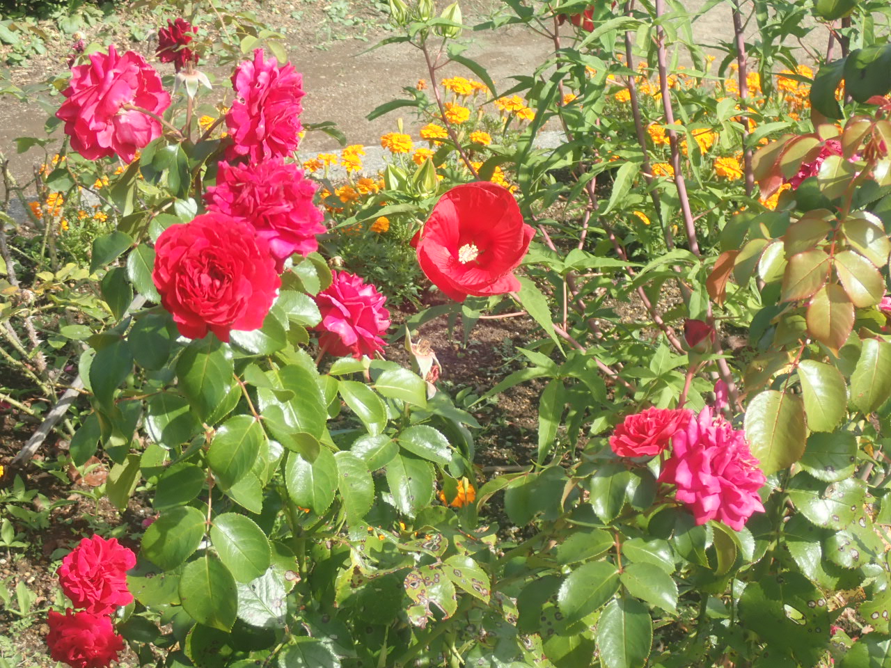 西洋庭園では、タイタンビカスやバラが咲いています。