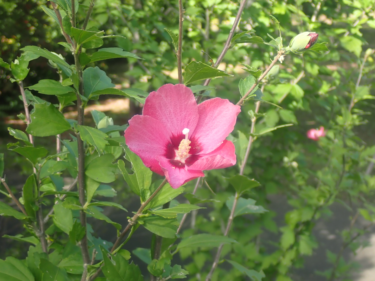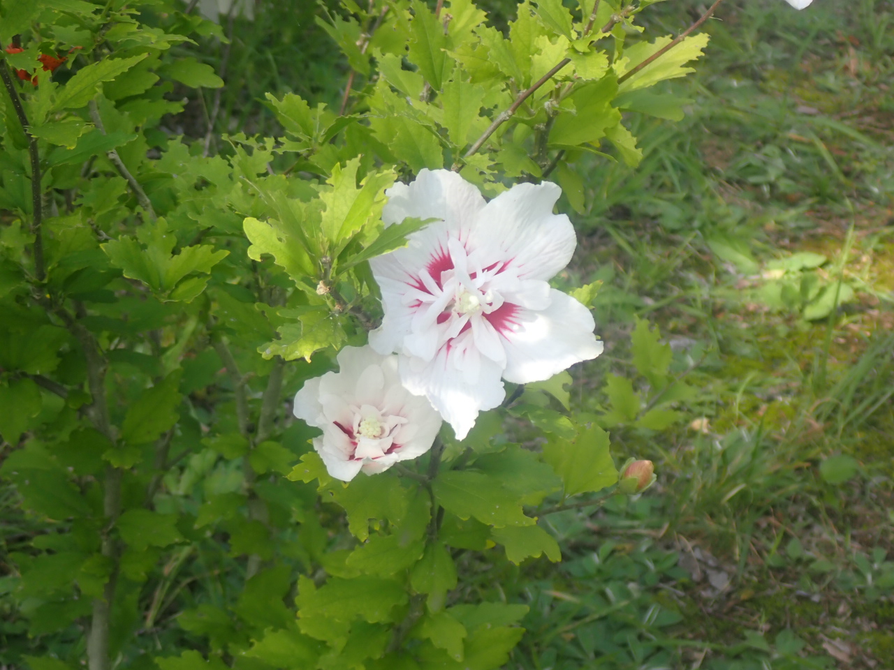 白や赤のムクゲが咲いています。