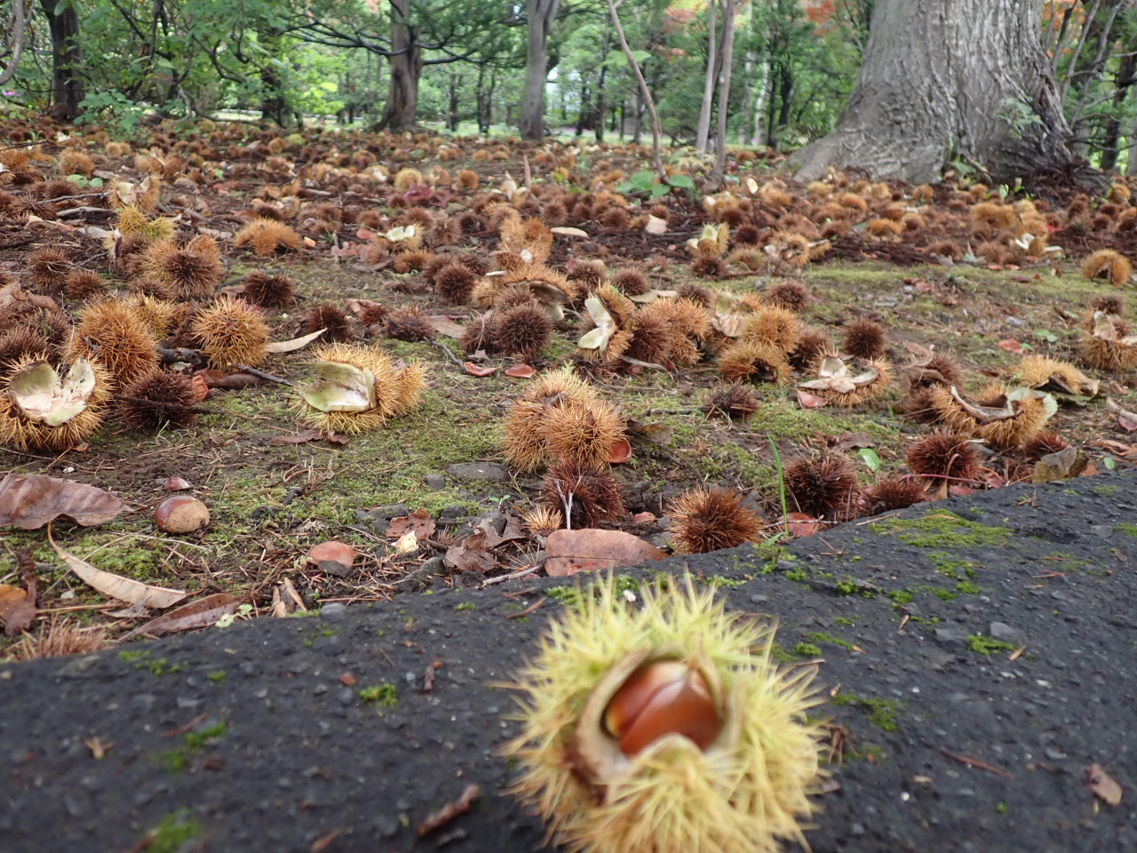 2週間前にも紹介したクリですが、今度はしっかりと実を付けたクリが落ちてきています。