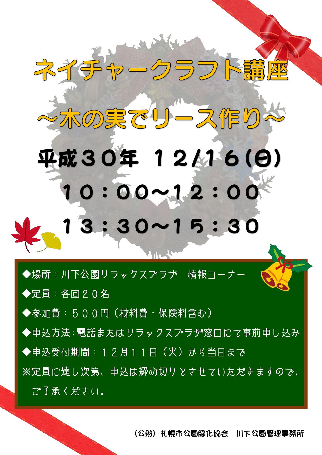 12月16日(日曜日)に「ネイチャークラフト講座~木の実でリース作り~」を開催します。