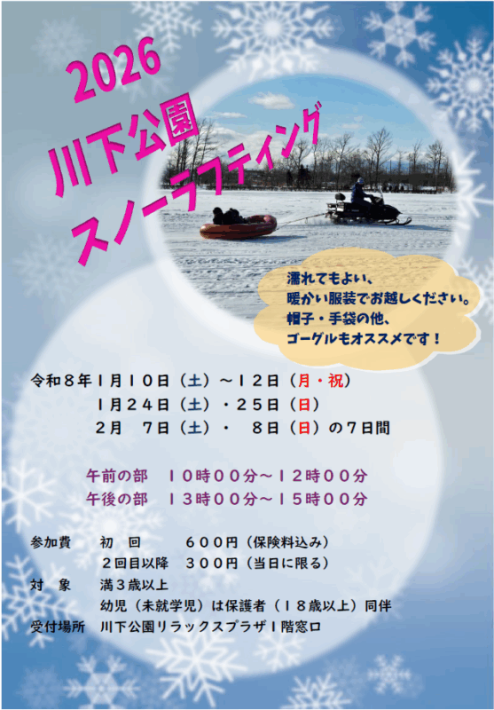 川下公園では、1月から2月にかけての週末に、今年も人気の「スノーラフティング」をお楽しみいただけます。