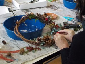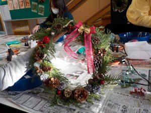 今回はブドウつるのリースを使い、クリスマスとお正月用のリースを作っていただきました。