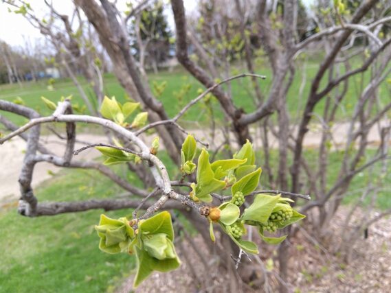 こちらは濃い紫色の蕾が確認できます。ライラックの花色はヴァイオレットやブルー、マゼンタなど7種類の色に分類されます。この蕾は、何色の花を咲かせてくれるのでしょう。