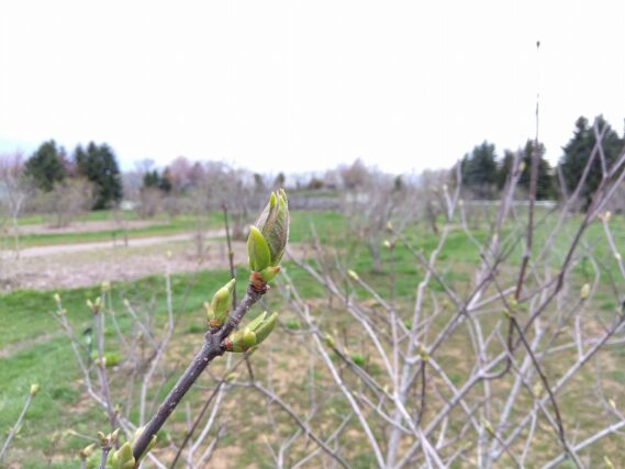 札幌の桜も見頃を迎え、そろそろライラックの開花が気になる頃となりました。本日のライラックの森の様子です。寒々しい空の下、左奥には桜が咲いています。ライラックはというと、まだ、全体的に葉も少なく枝の姿が露わです。