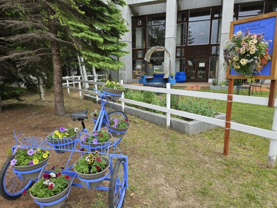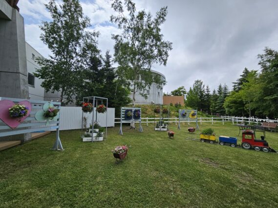 ライラックまつりの期間中、ライラックの森で皆さんの写真スポットになっていたハンギングバスケットや馬車、自転車などの花飾りは、現在リラックスプラザ中庭に移動しております。