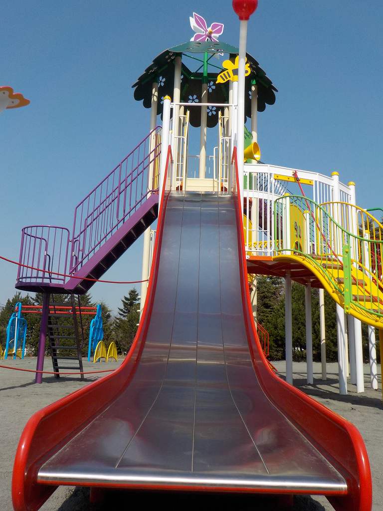 写真左側の赤いすべり台は、たくさんあるすべり台の中でも一番傾斜が緩かったです!