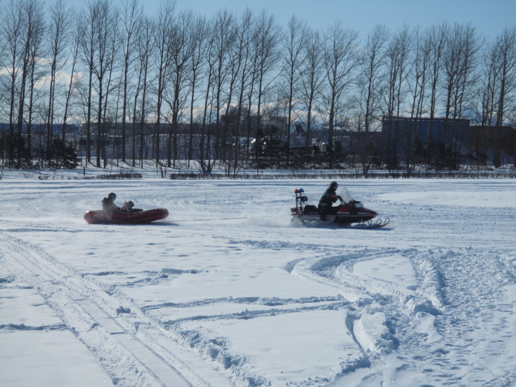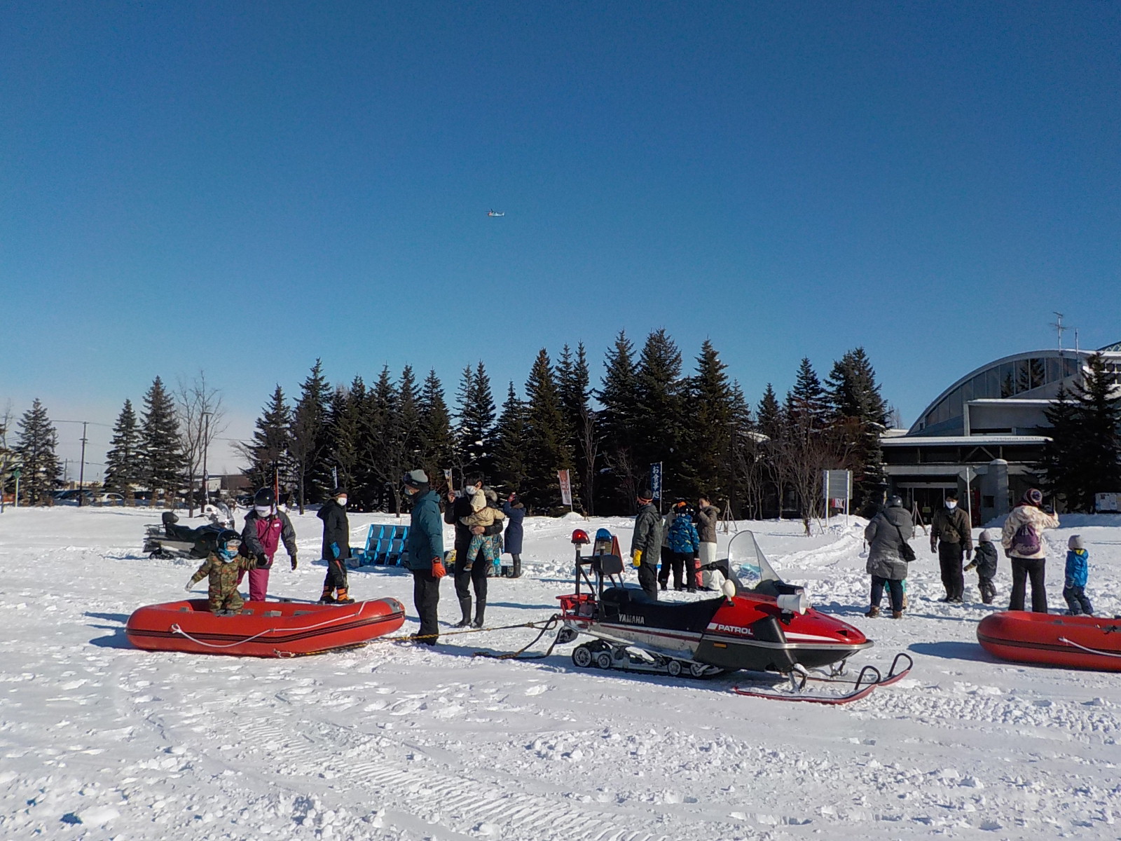 川下公園では、昨日から雪上ラフティングボートを開催しています。