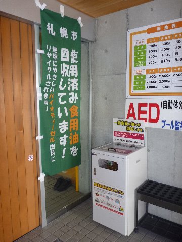 川下公園リラックスプラザでは、ボイラー用燃料としてエコ重油を利用しております。エコ重油は、灯油と廃食油(使用済みの天ぷら油など)を精製しBDF(バイオディーゼル油)と混合した環境に優しい燃料で二酸化炭素排出量が大幅に軽減されます。 つきましては、川下公園リラックスプラザ正面玄関内に廃食油回収ボックスを設置しておりますので、ご家庭から発生する廃食油回収のご協力をお願いいたします。なお、回収いたします廃食油につきましては、500ml(ミリリットル)サイズのペットボトルに入れてお持ちください。