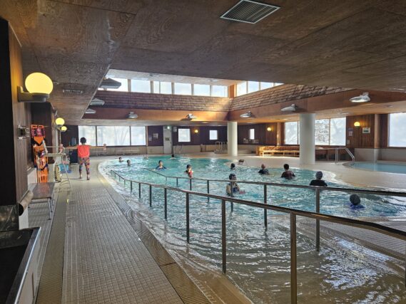 川下公園のプールは、曲線が特徴的で、水深が110cmとやや浅く、水中運動に適したプールです。
