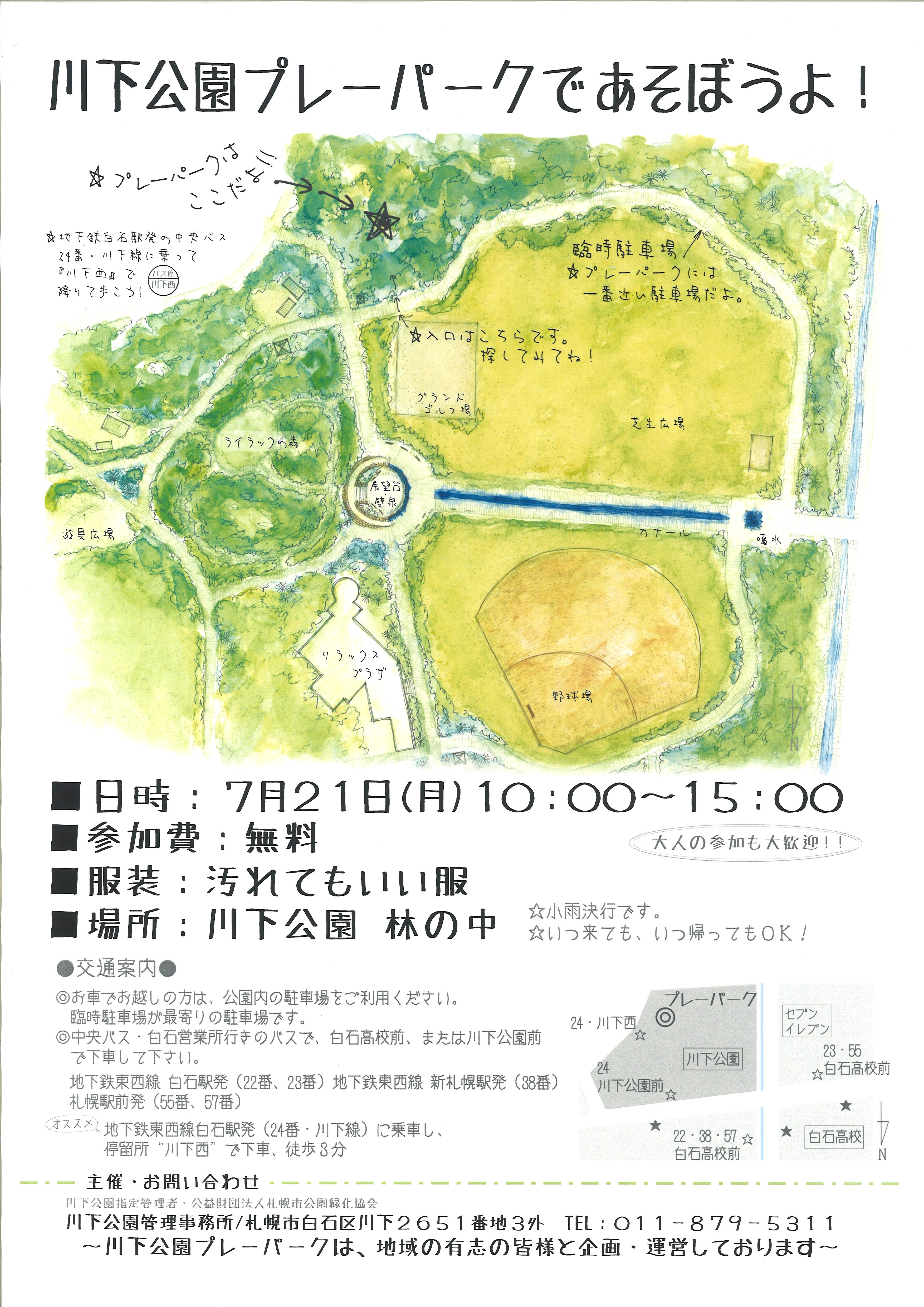 久々の川下公園プレーパークが21日(月)10:00~15:00に行われます。
