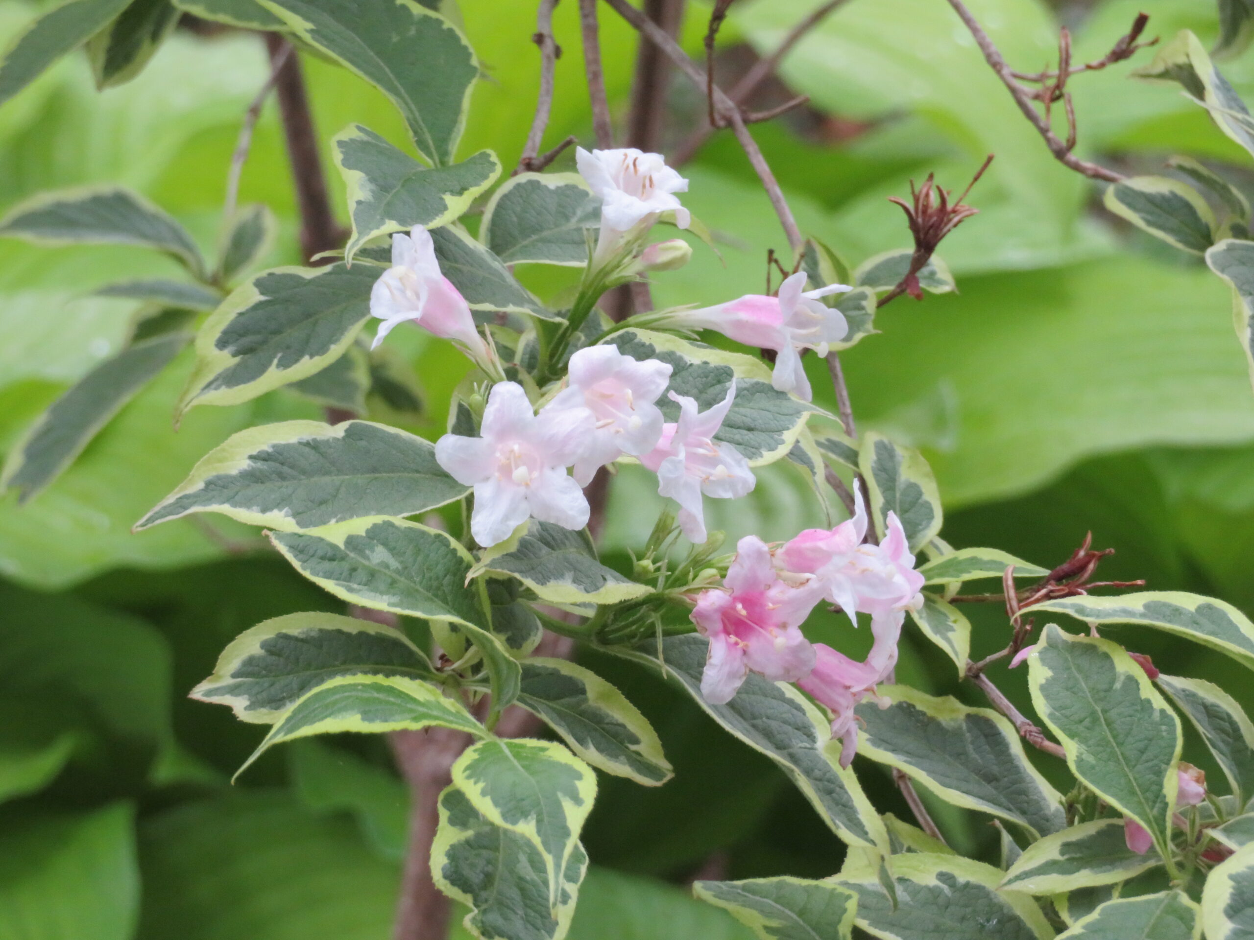 薄いピンクの可愛らしい花と、やや黄味がかった白の覆輪の斑入り葉を持つ人気の低木です。耐寒性・耐暑性ともに強く、育てやすい品種です。樹高は2から3m程度まで育ちます。
