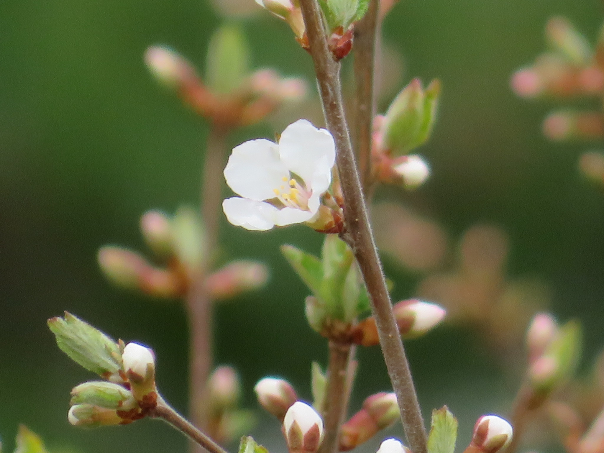 ユスラウメは、ウメに似た5弁の白~淡紅色の花を枝いっぱいに咲かせます。牧野富太郎博士によると、食用できる果実を収穫するのに木をゆするので、この名がつけられたのではないかといわれています。樹高は1.5~3m程度です。