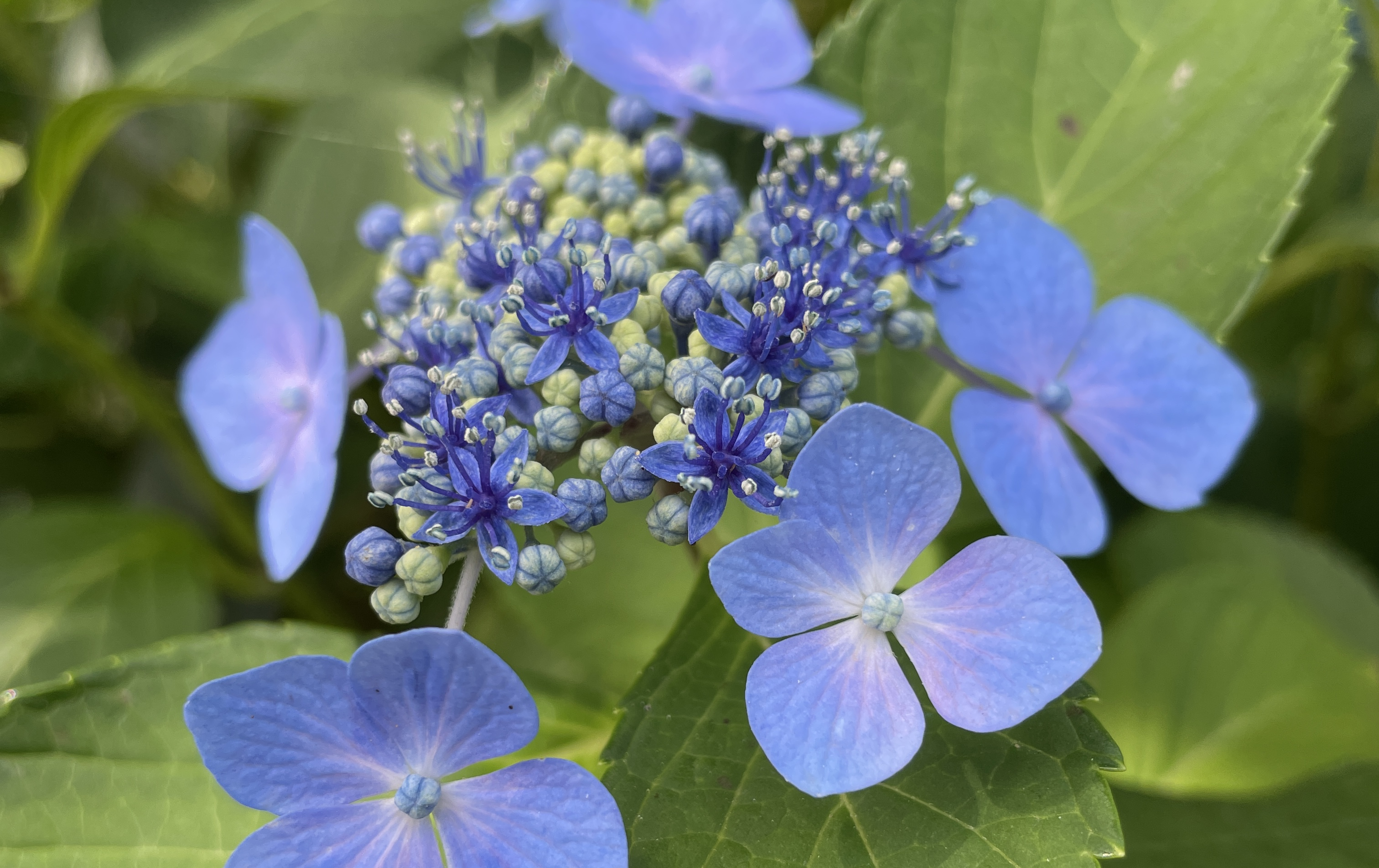 ガクアジサイは日本に昔からあるタイプのアジサイで、周囲に花が縁取るように咲くことから「額アジサイ」と呼ばれます。樹高は1~2m程度です。