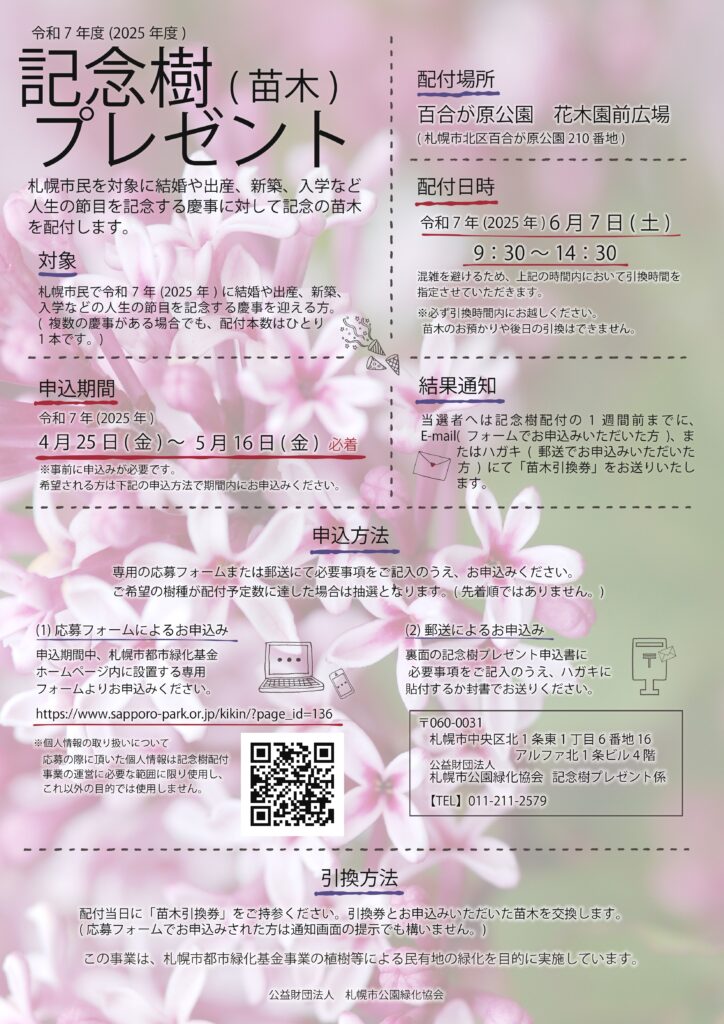 札幌市民を対象に結婚や出産、新築などの人生の節目を記念する慶事に対して記念樹(苗木)の配付を令和7年度(2025年度)も実施します!