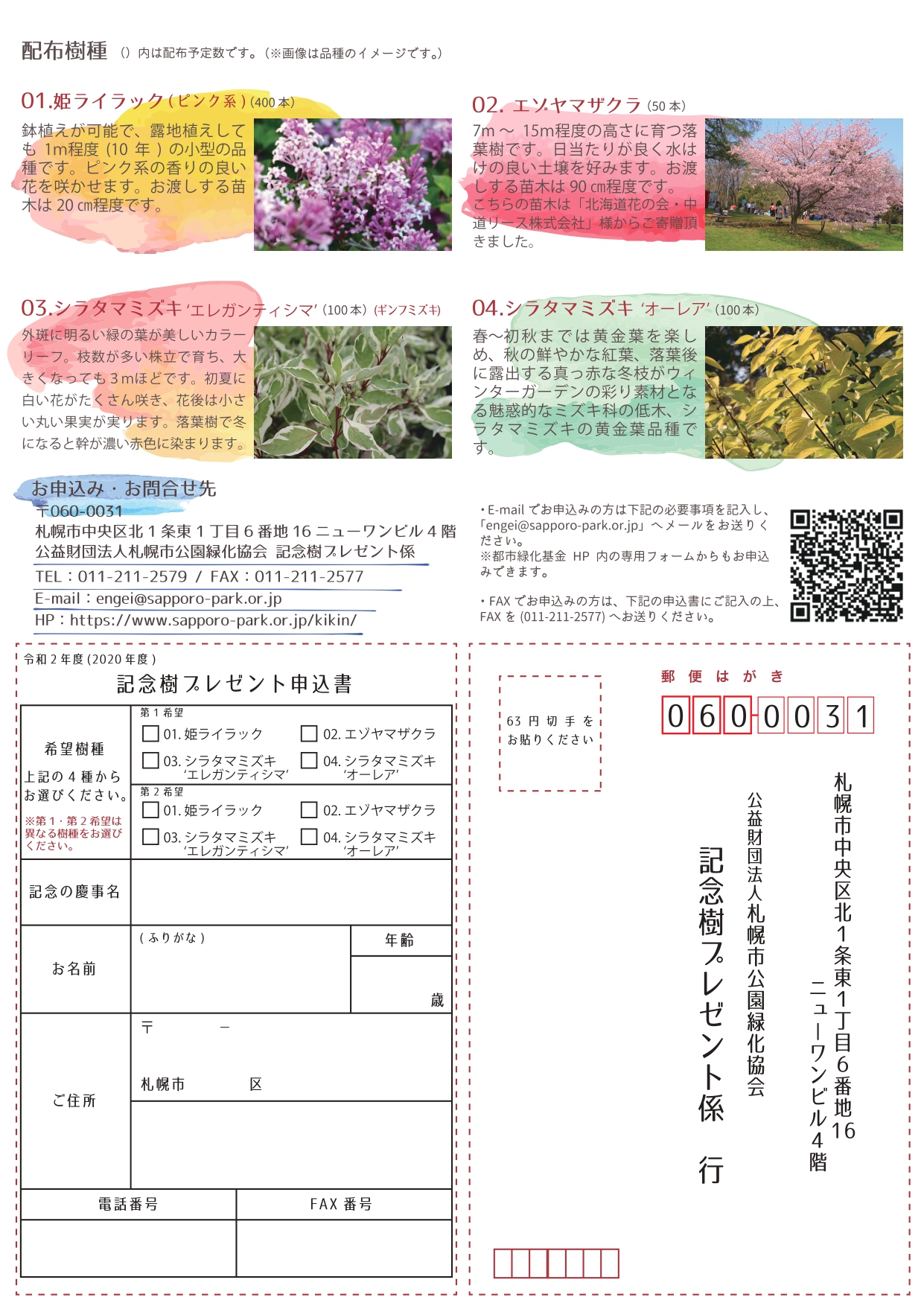 当協会で管理する公園(管理事務所)や区役所、地区センター等にて配布しているチラシ裏面の”記念樹プレゼント申込書”へ必要事項をご記入のうえ、FAX番号 011-211-2577 へお送りください。